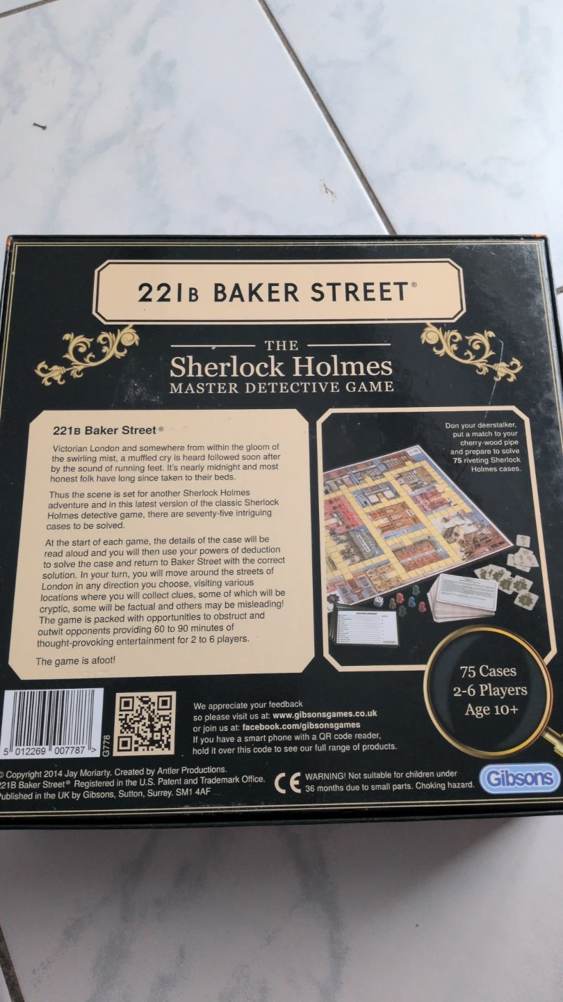 124Selling the classic 221B Baker Street Sherlock Holmes Master Detective Game by Gibsons! It comes with 75 cases for 2-6 players, and is recommended for ages 10+
