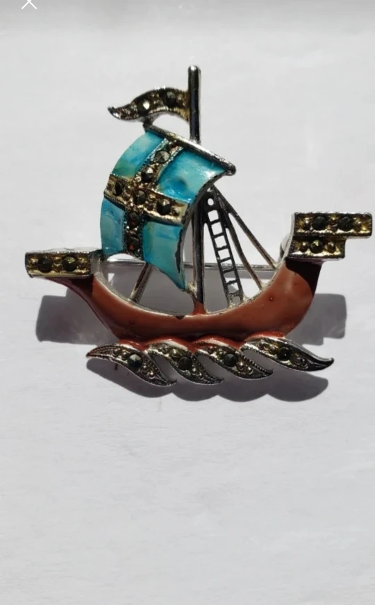 This is a lovely brooch in silver tone metal in the form of a Galleon in full sail in blue and brown enamel and set with marcasites. It has a roll over safety clasp and is in very good condition.