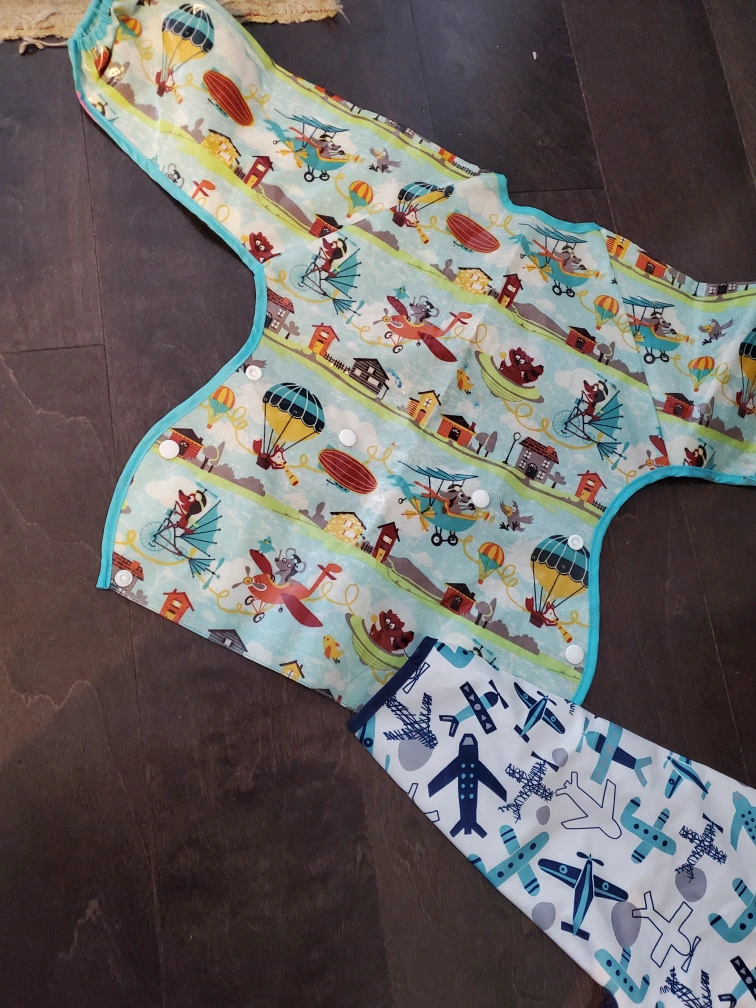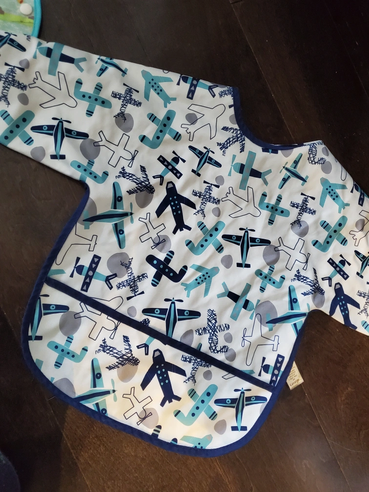 1 is vasy to wipe clean ; the blue airplane one is a nice cloth material. Both can be used when your little one is eating, painting etc.