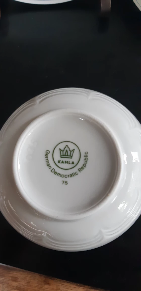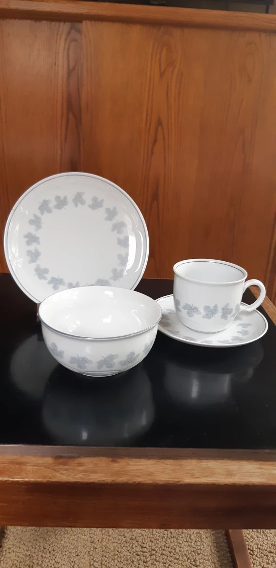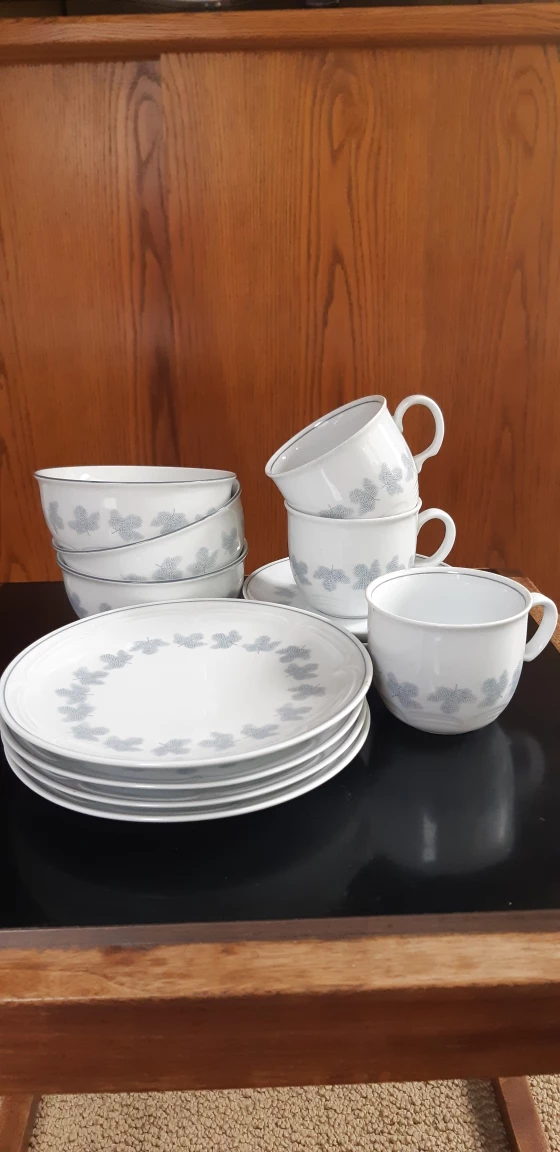 828High quality porcelain by Kahla of Germany 3 plates, 3 bowls, 3 cups and saucers Pretty bluish-grey leaf design