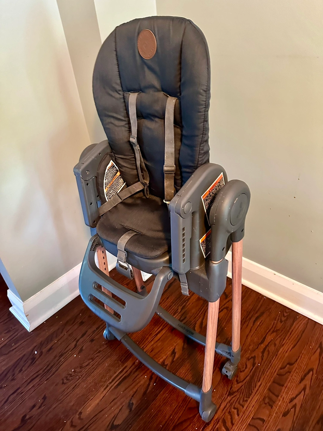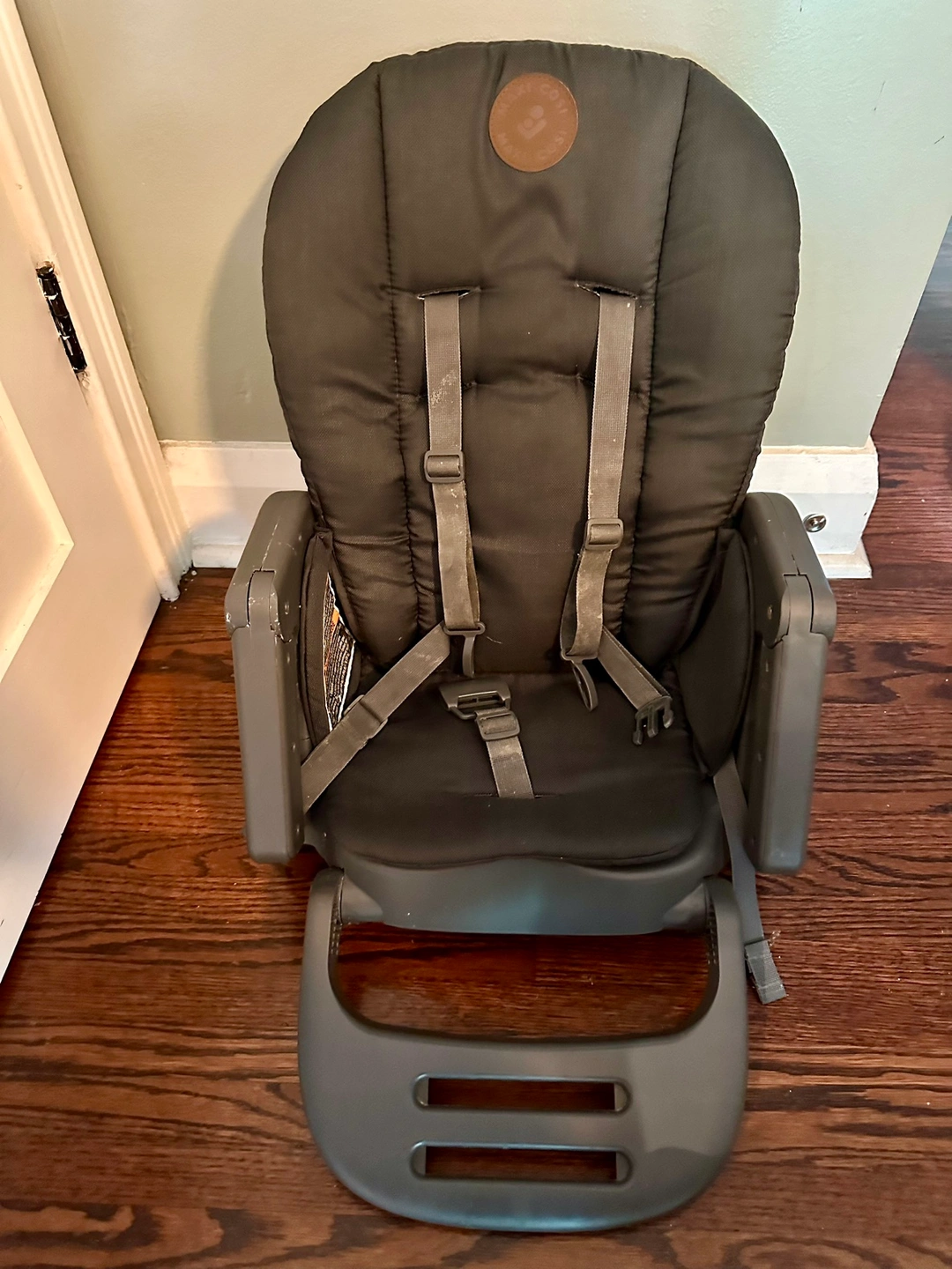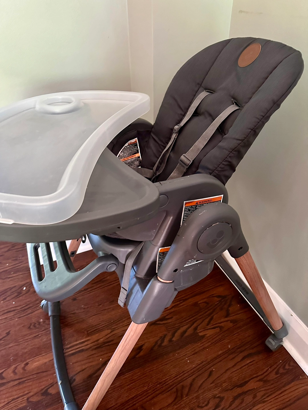 Foldable and detachable. 2 tray options. 4 seat/recline options. Foldable arm rest and foot rest. Removable and washable cushioned seat cover. No chips, no scratches, from smoke-free home. Free bibs.