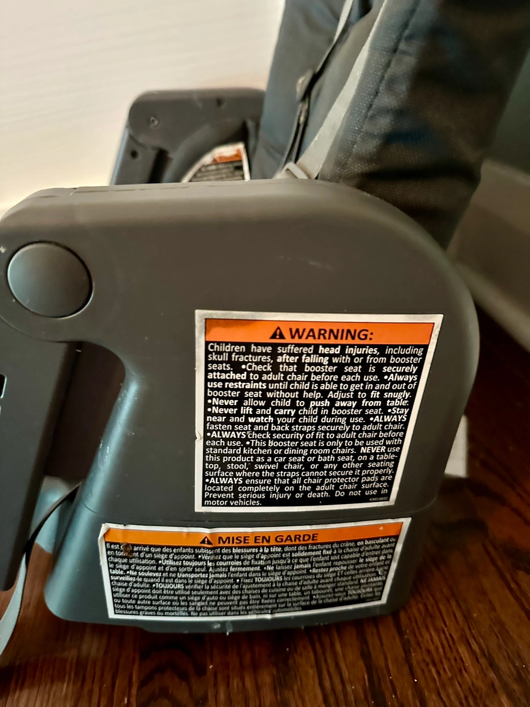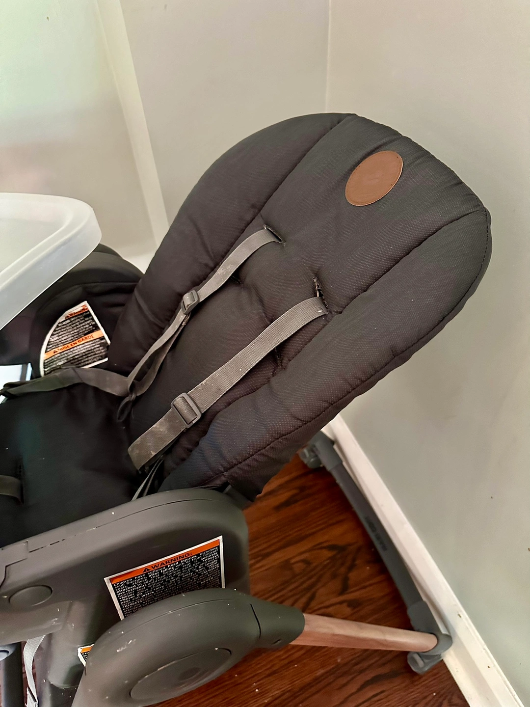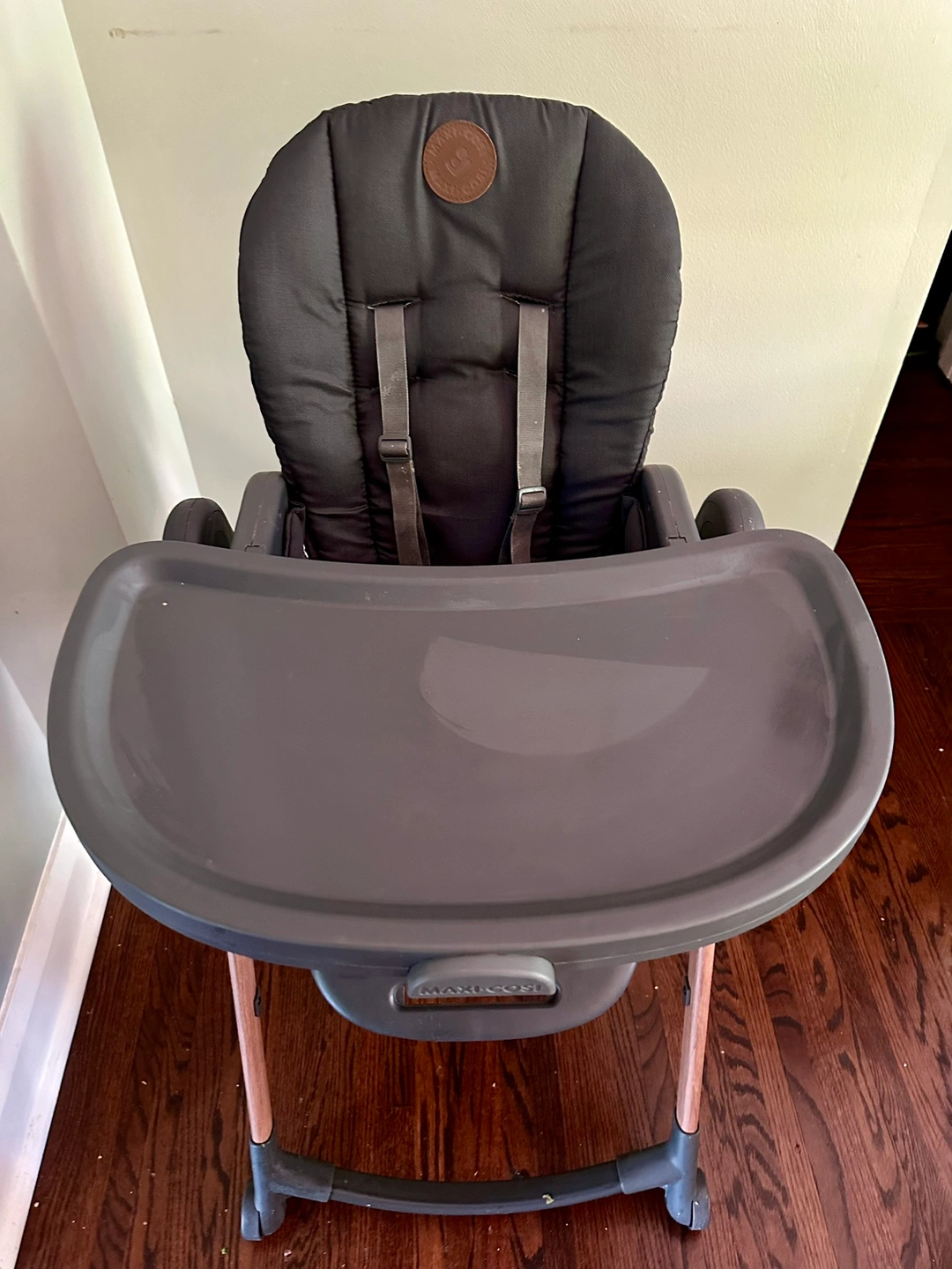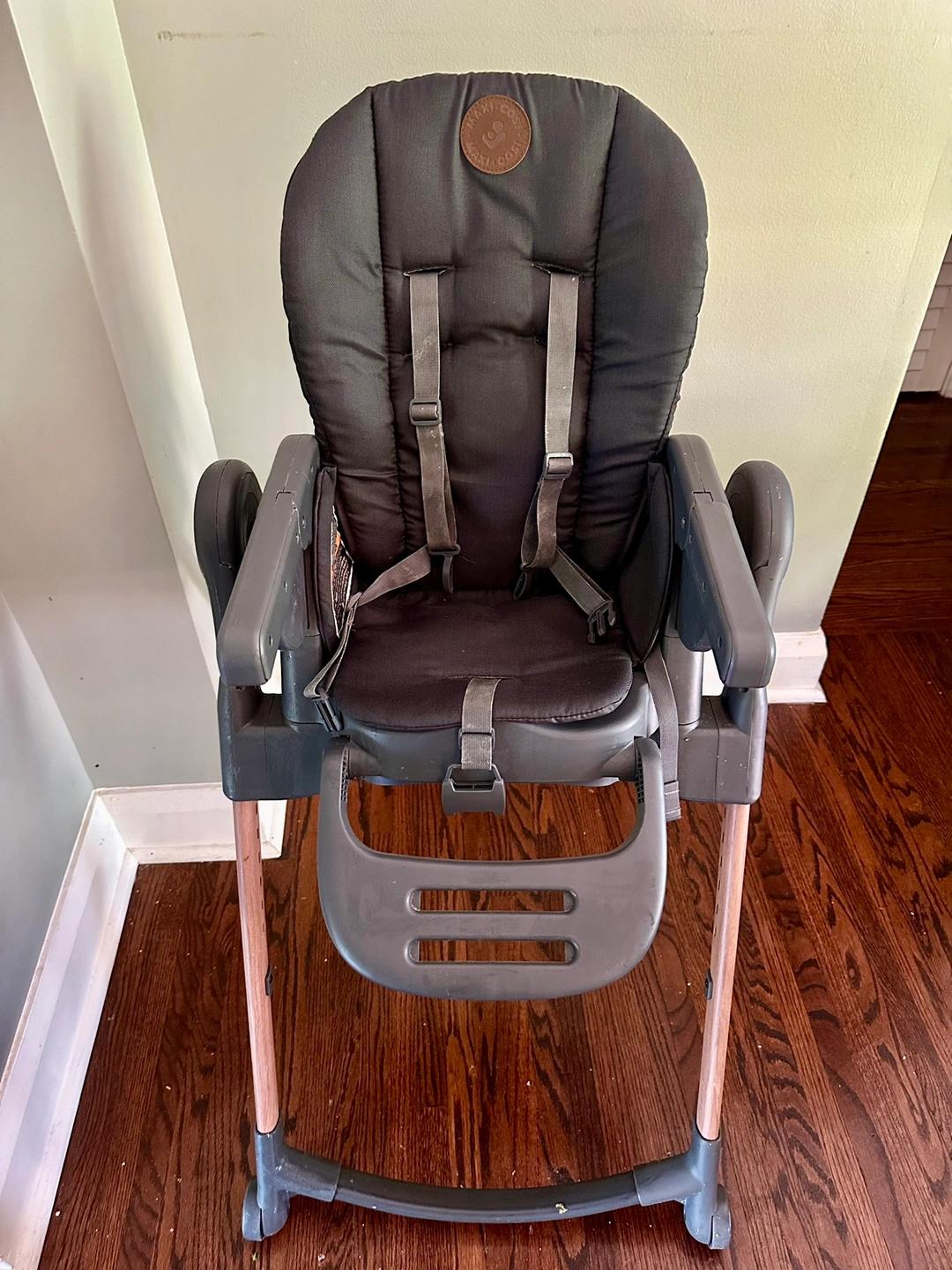 Foldable and detachable. 2 tray options. 4 seat/recline options. Foldable arm rest and foot rest. Removable and washable cushioned seat cover. No chips, no scratches, from smoke-free home. Free bibs.