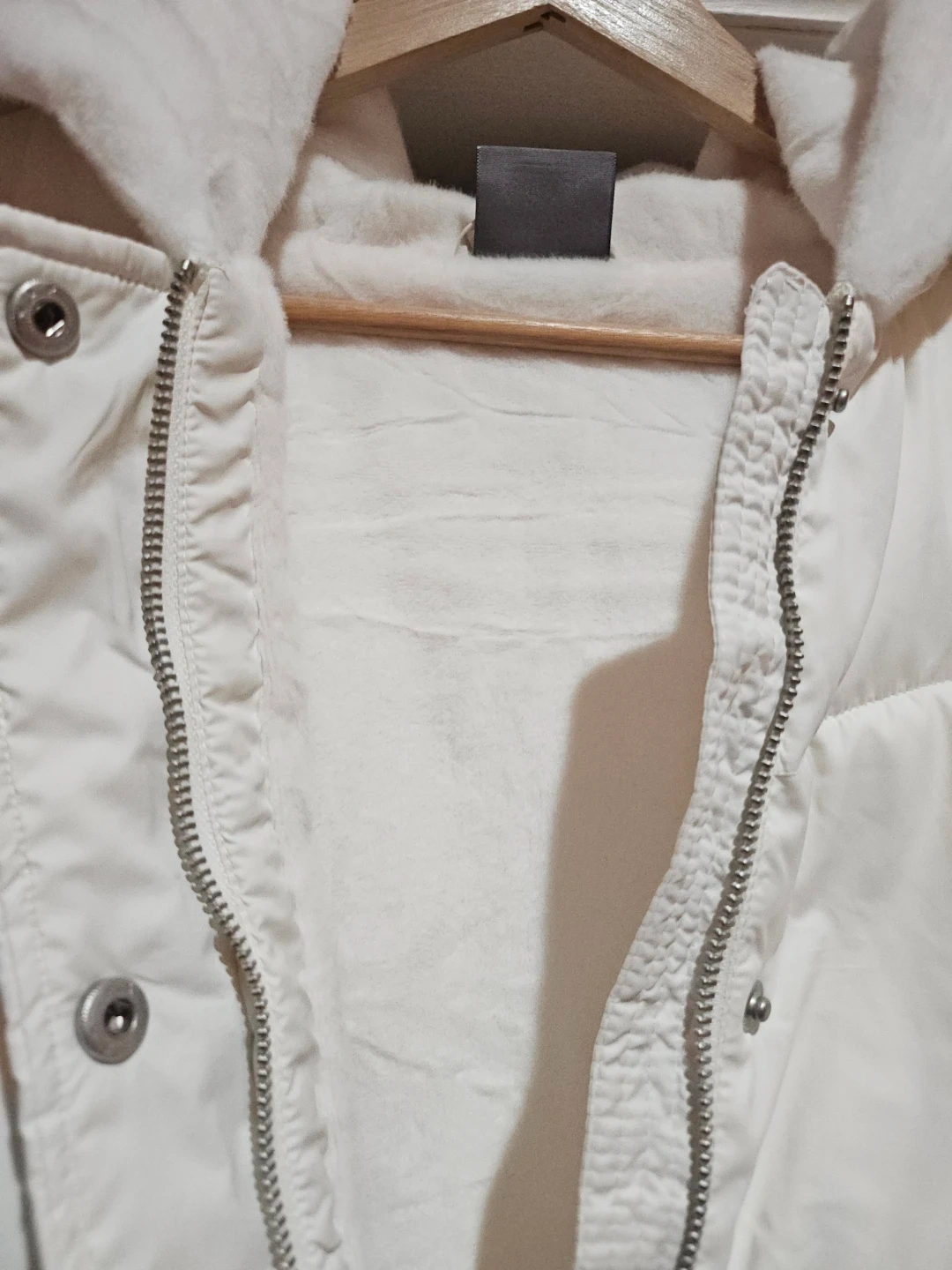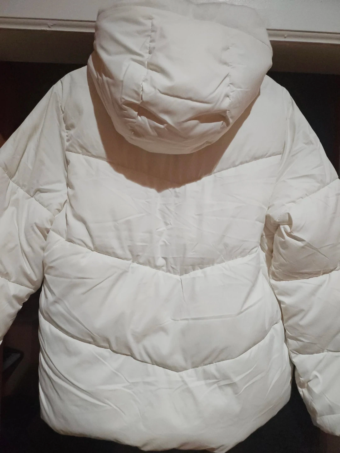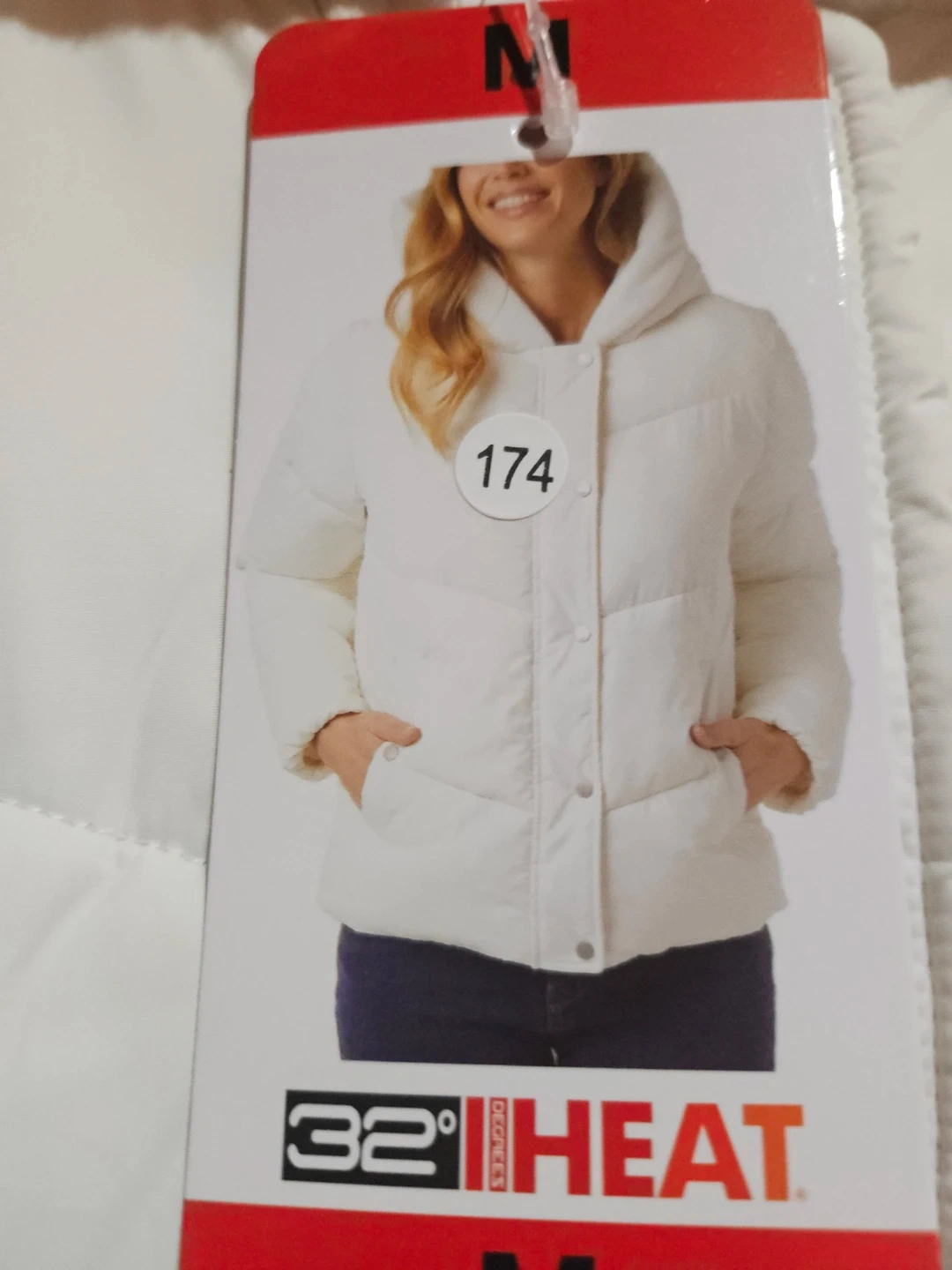 Stay warm in this 32 Degrees Heat puffer jacket. It's white and features a hood. This jacket is a size medium.