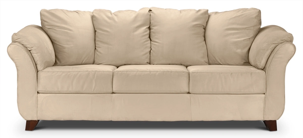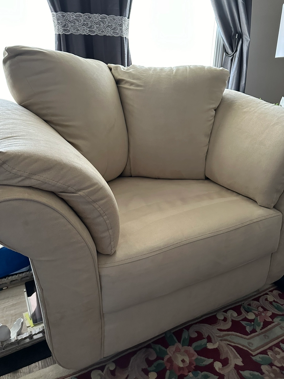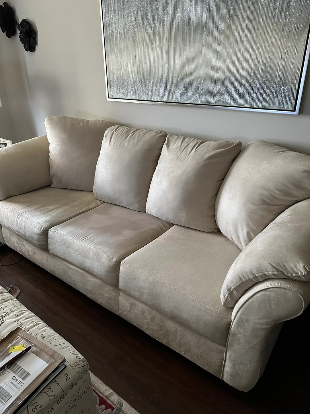 The combination of flared arms and legs give these pieces a unique silhouette, and the soothing beige microfibre is smooth and luxurious. Overstuffed cushions, padded arms and no-sag springs serve as a perfect path to comfort. They are less than 3 years old and in good condition. The chair is less used than the sofa. But both are very comfortable. $500 is for both pieces. Colour is more the same as the first two photos. Last three photos are of the couch & chair in my home, so lighting isn’t as good.