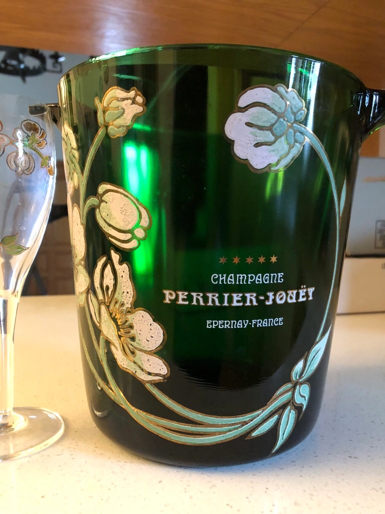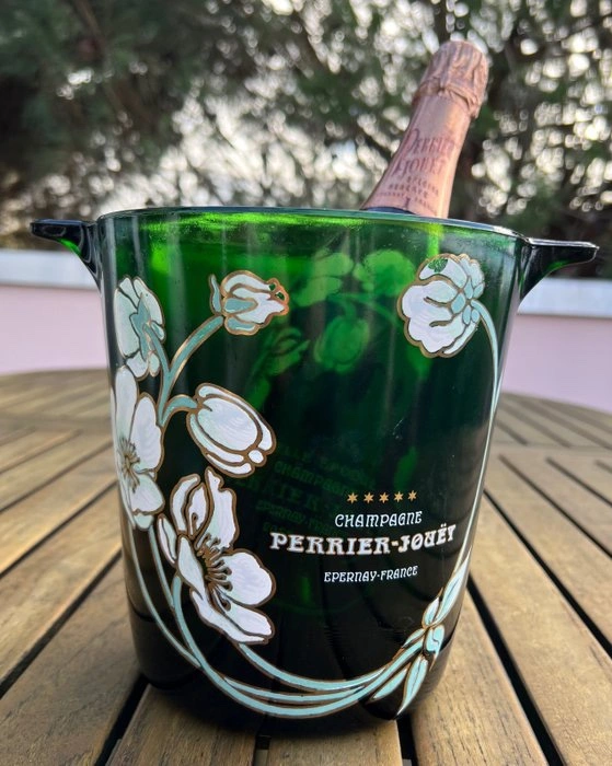 The iconic Art Nouveau Japanese anemones motif was originally designed/created by Emile Gallé in 1902 for Perrier-Jouet Belle Epoque Cuvée champagne bottle.