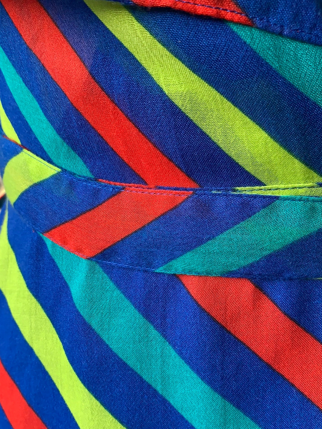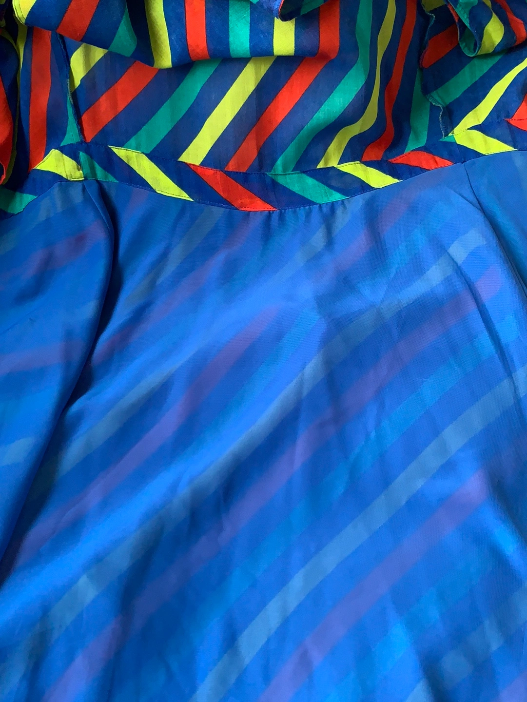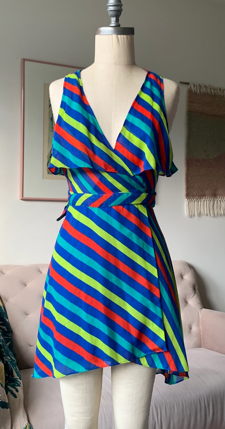 Beautiful multi colour flowy wrap around dress has a lined skirt bottom.