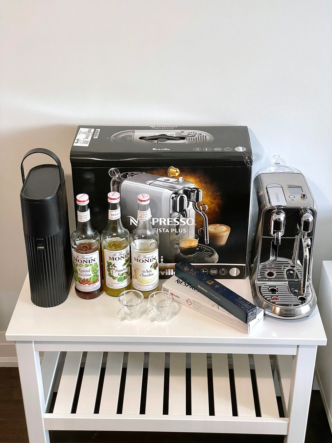 ✨Bundle includes recycling bin, Monin syrups, Nespresso coffee pods, espresso cups and a descaling liquid