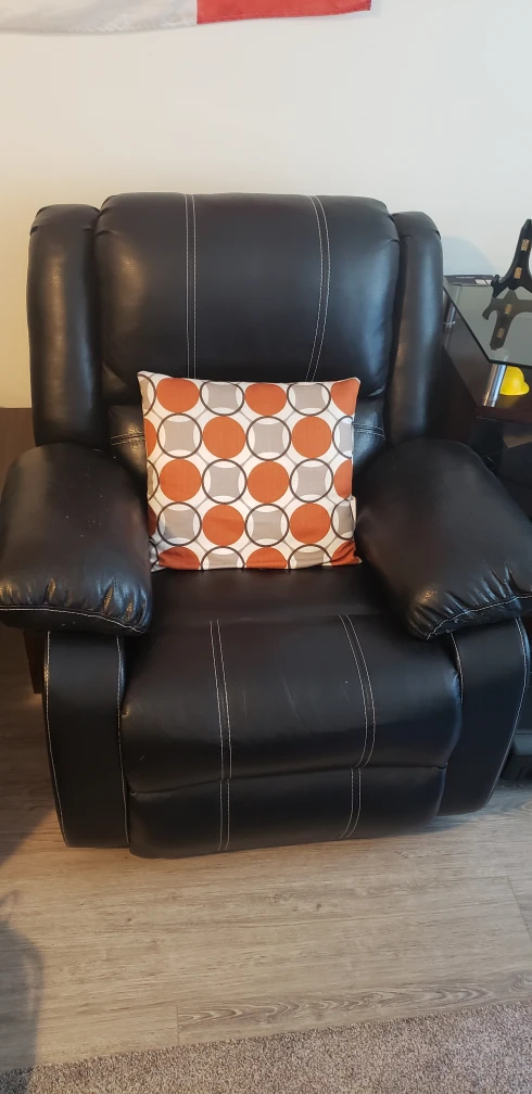 comfortable rocking chair recliner, black, has wear and tear on the arm rests. Over-all it is in okay condition.