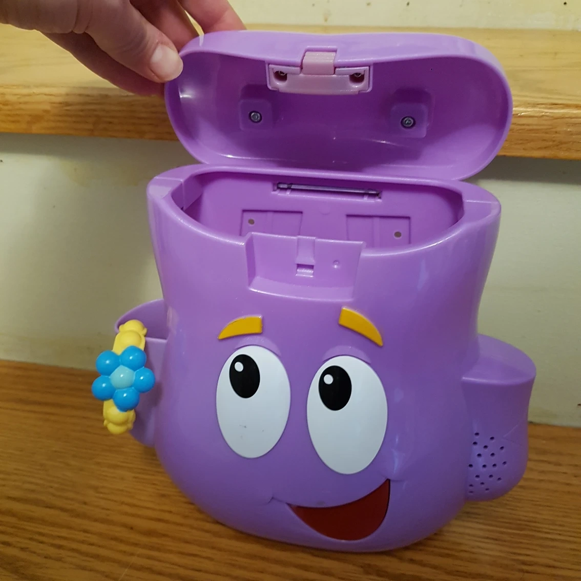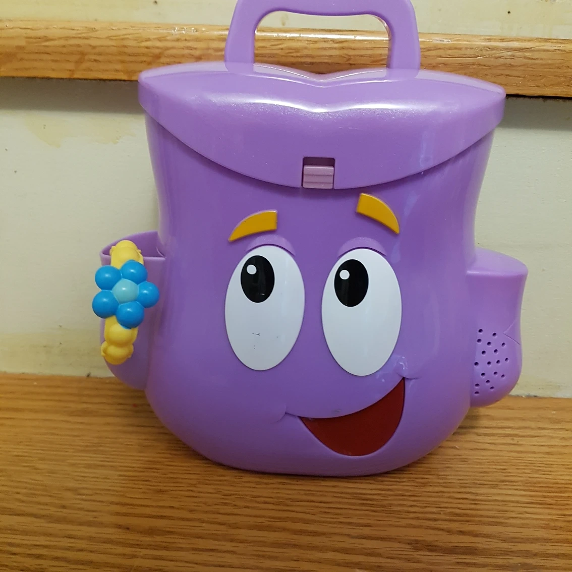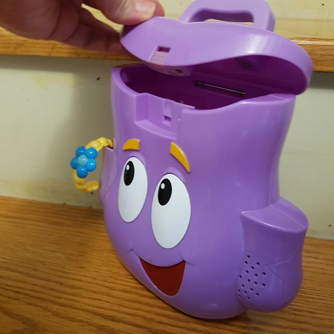 Works perfectly. Speaks when the mouth is pressed. Sings the backpack song and says other things.