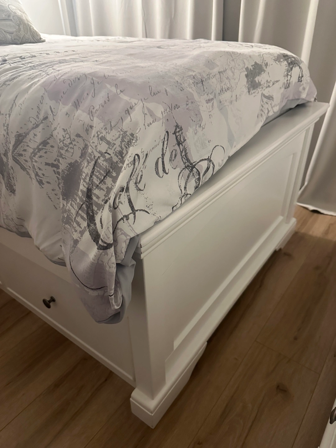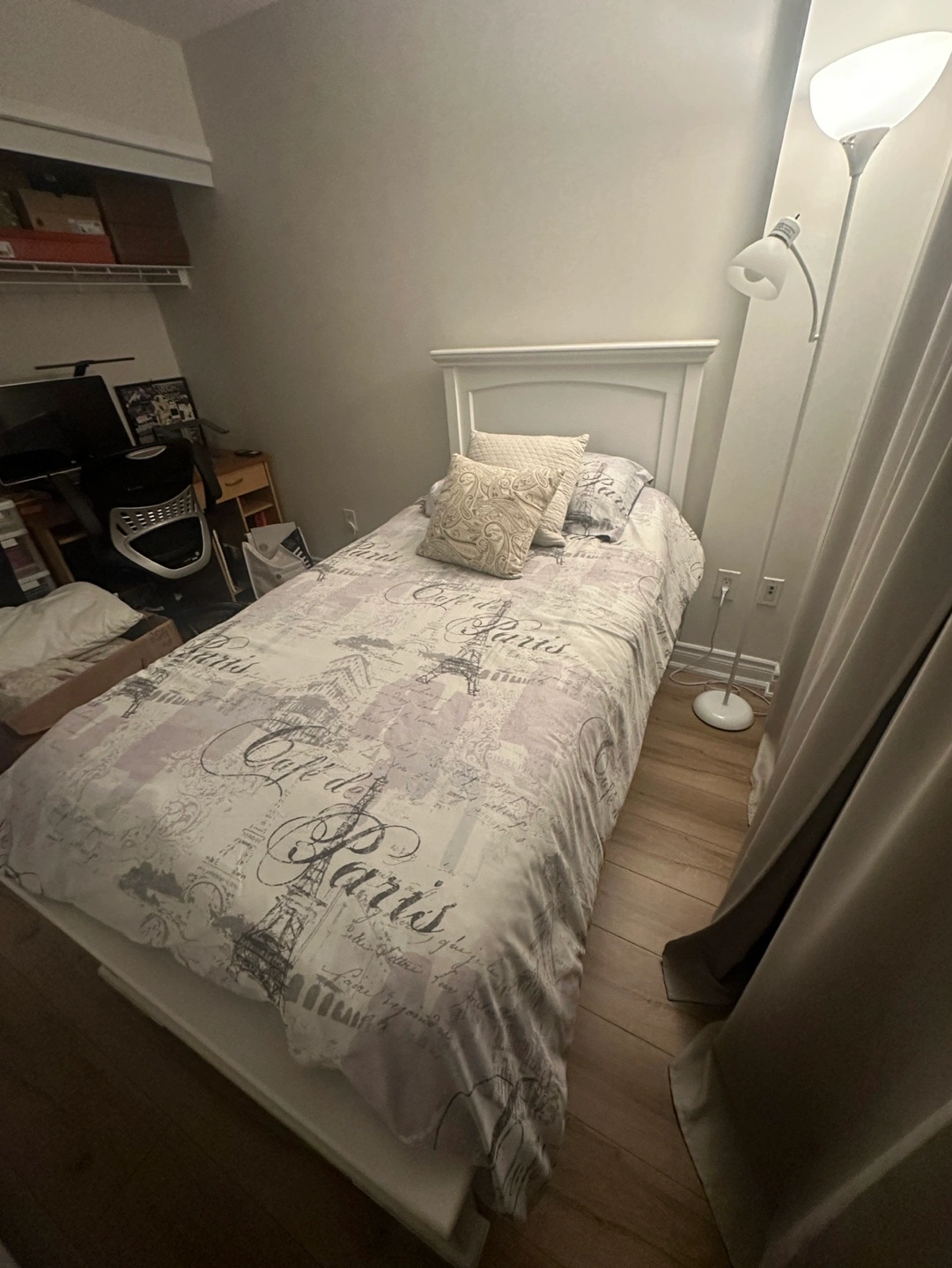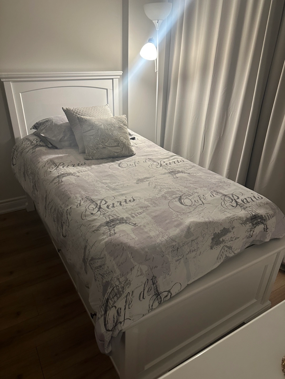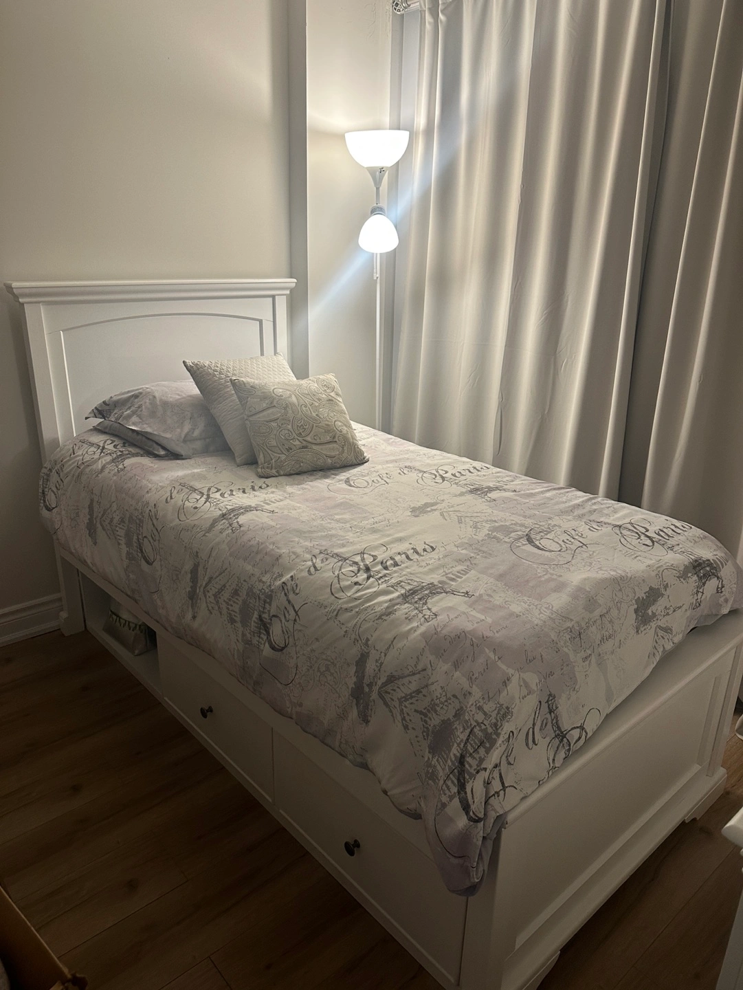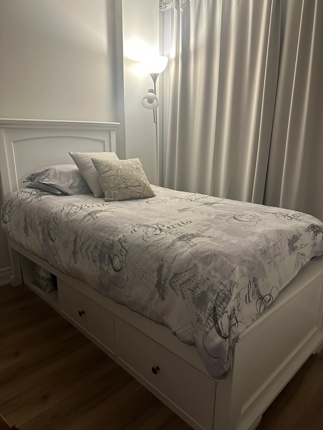 Selling a solid wood bed with the mattress included (twin xl). The bed is in great condition and has built in storage.