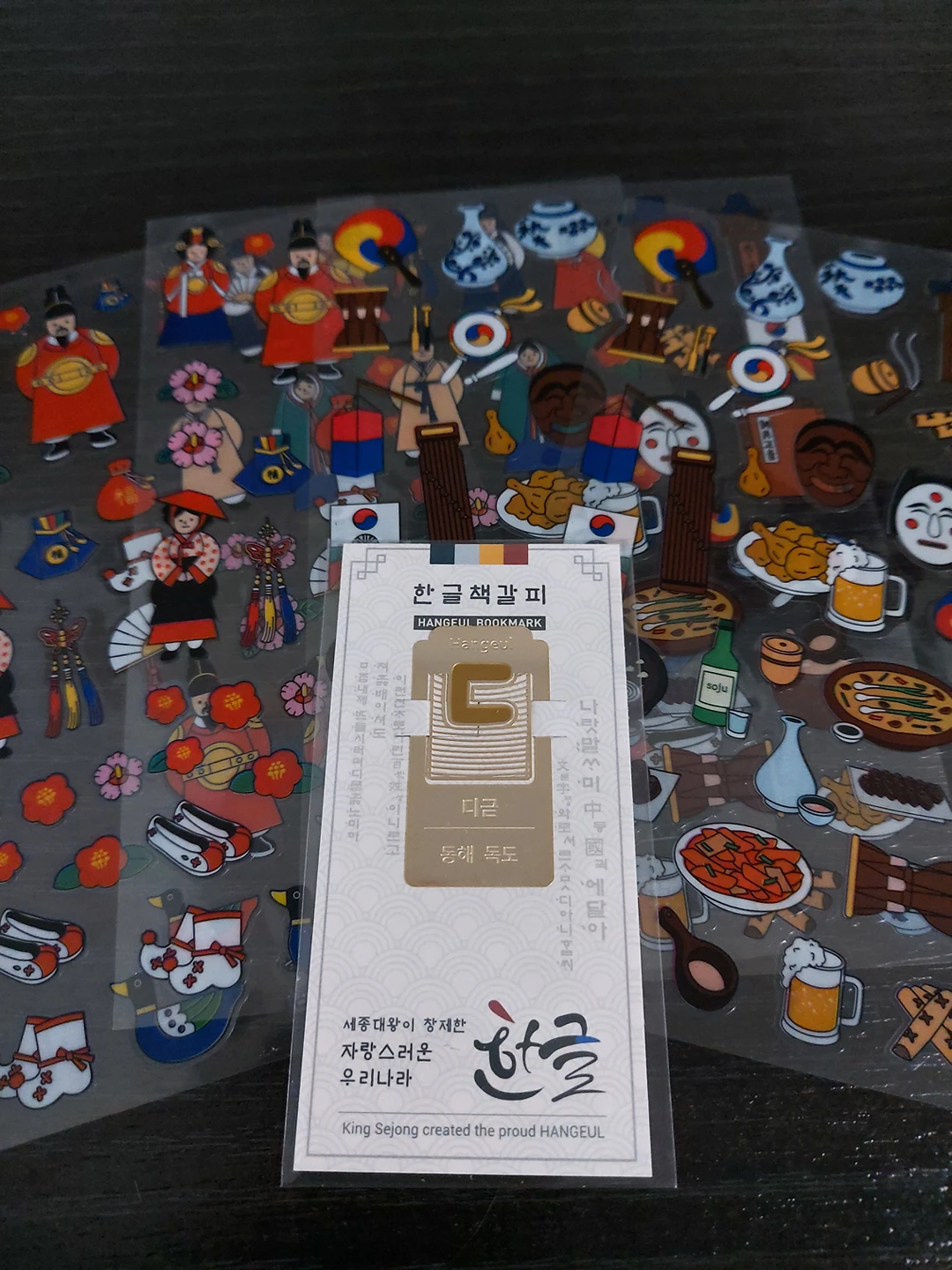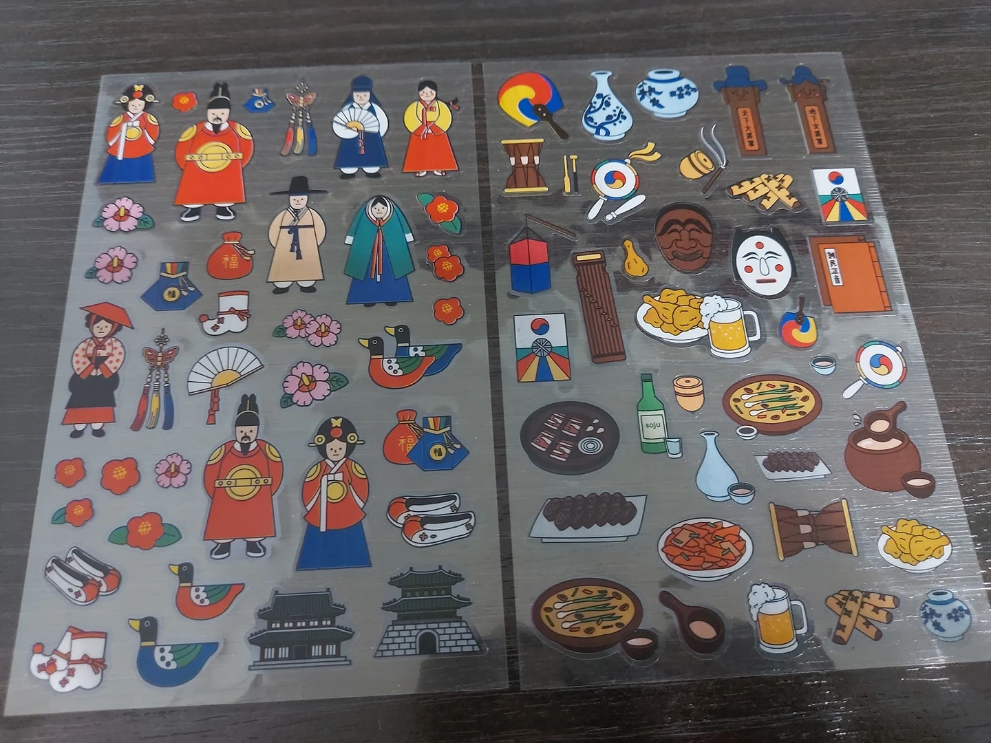 Stickers (4 sheets) - Korean traditional clothes (2 sheets) - Korean food and other tradition (2 sheets) 1 bookmark (never used)
