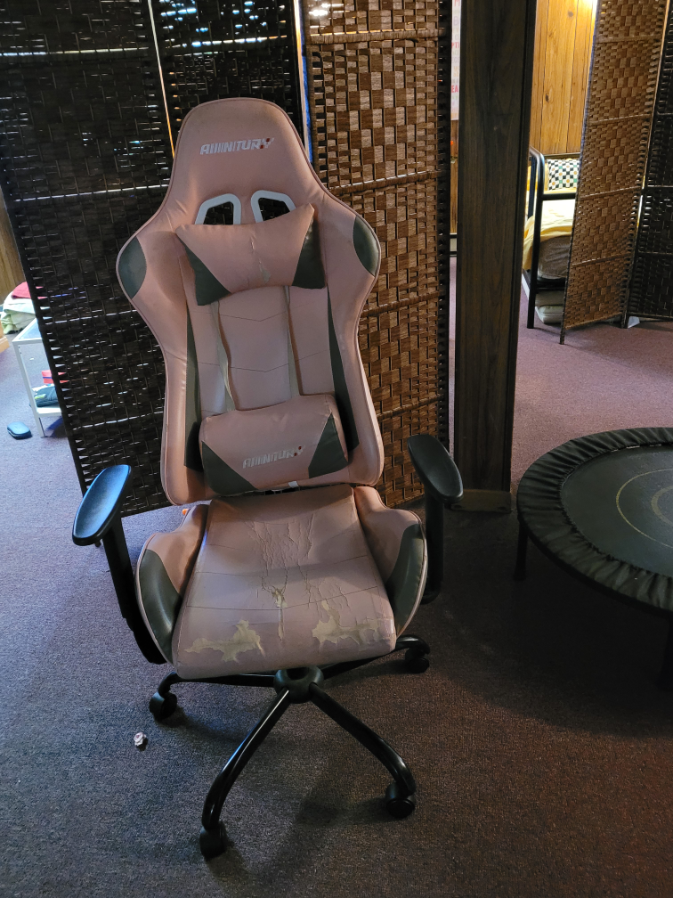 some wear on the seat. good strong chair. all levers work. pick up Victoria Park and Eglinton area Elvaston Drive just off of Sloan.