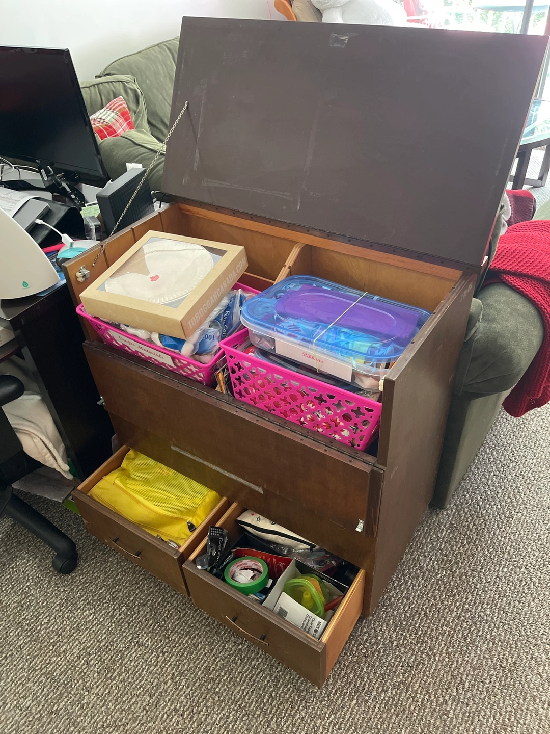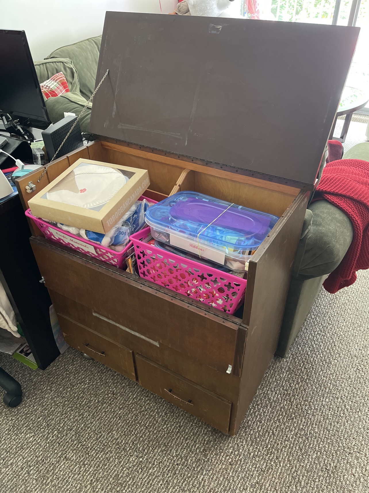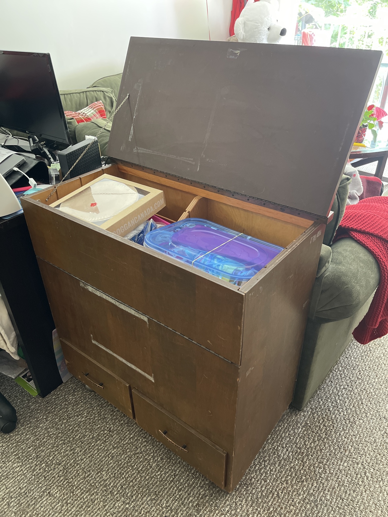 Vintage Wooden Storage cabinet perfect to store tools and supplies or any other items in your home or garage, has 2 drawers and top part can be opened as well as middle part of it. Only available for pick up, no delivery. From no smoking and no pets house.
