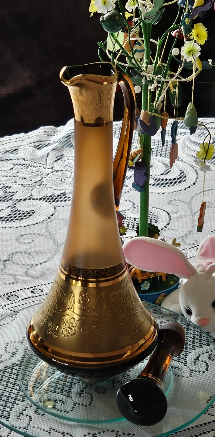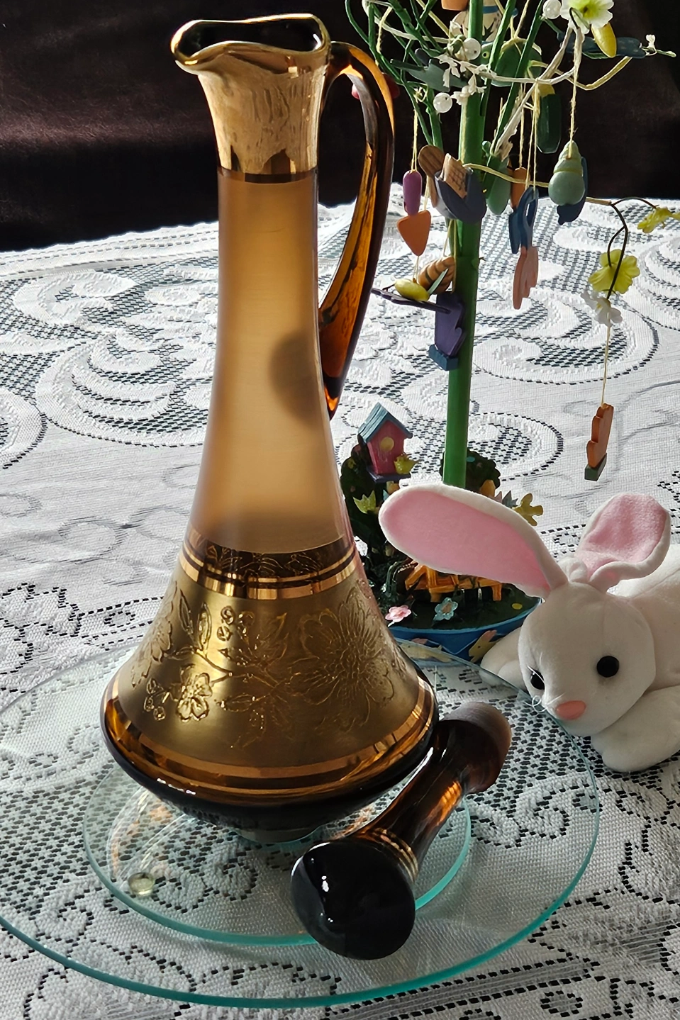 Material: Hand-blown amber glass with gold accents and floral designs.
