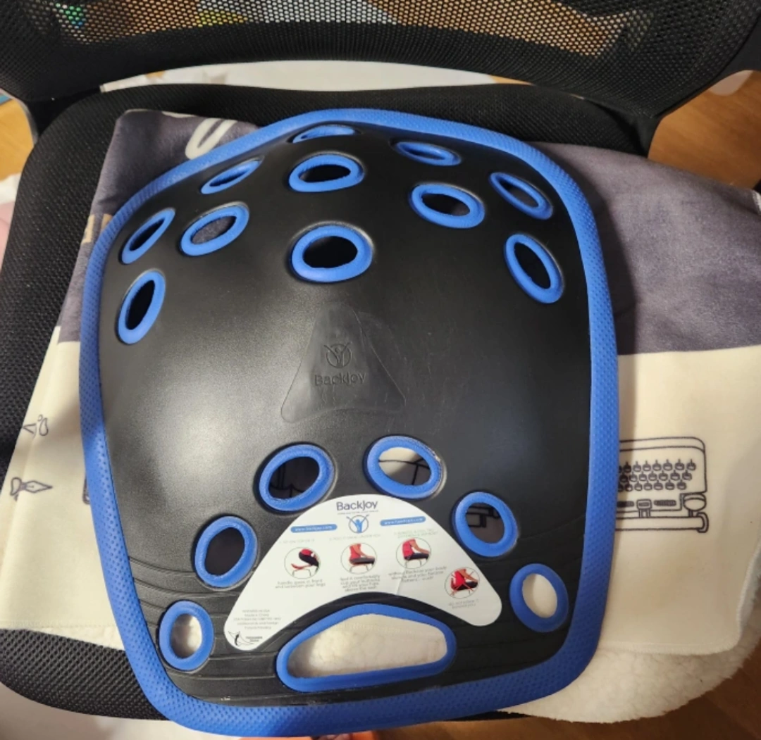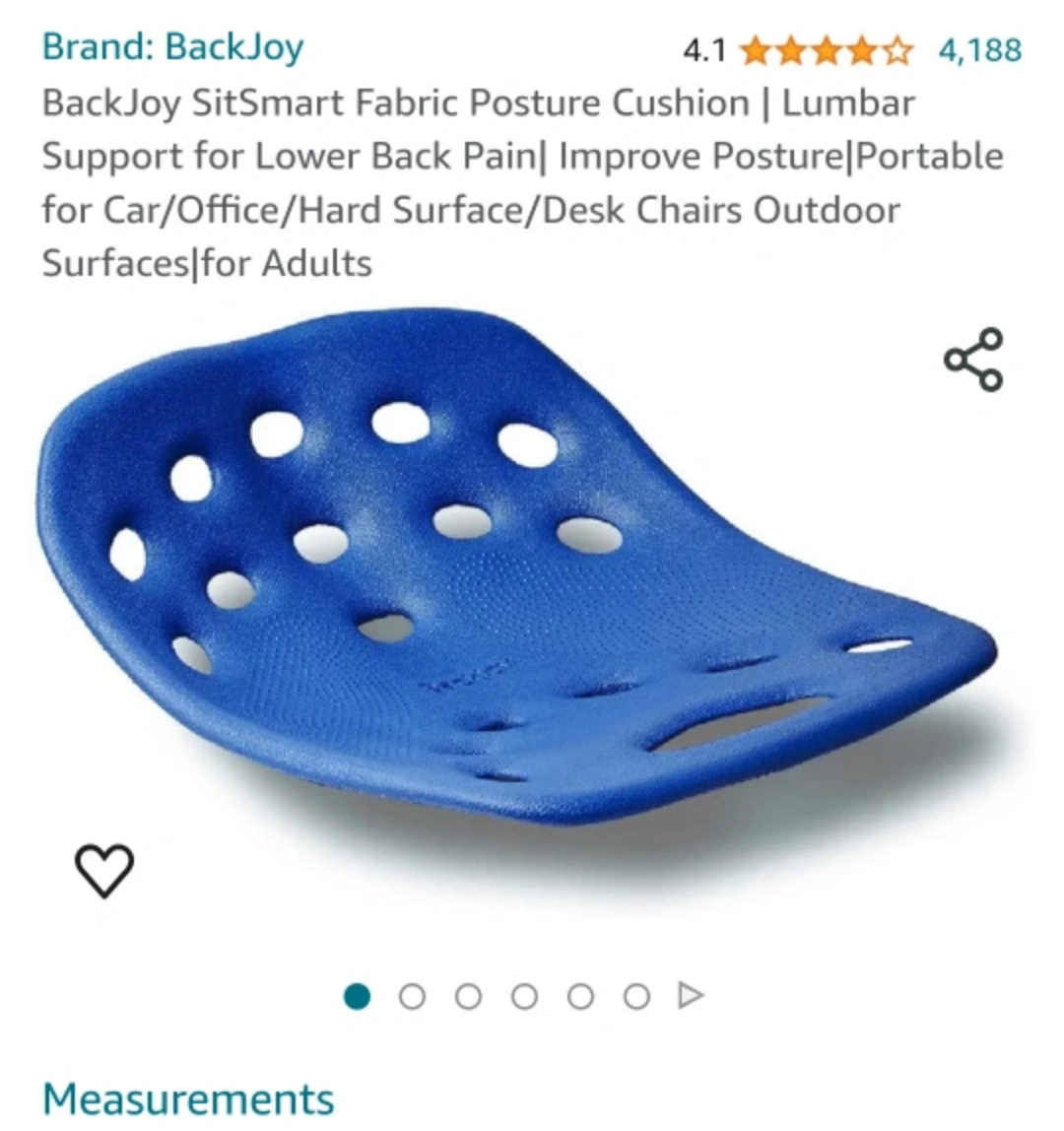 Link: BackJoy SitSmart Fabric Posture Cushion | Lumbar Support for Lower Back Pain| Improve Posture|Portable for Car/Office/Hard Surface/Desk Chairs Outdoor Surfaces|for Adults https://a.co/d/1wKiNPw