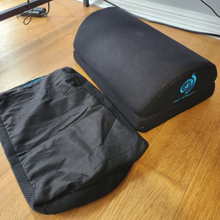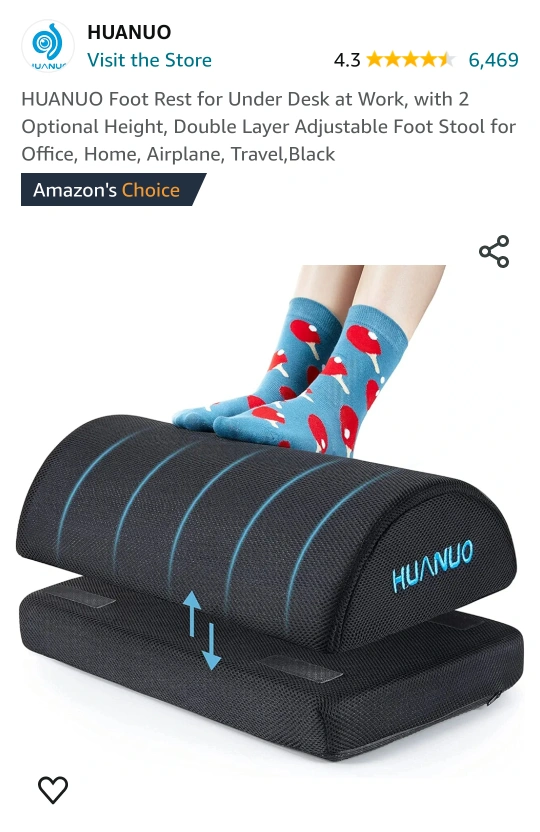Link: HUANUO Foot Rest for Under Desk at Work, with 2 Optional Height, Double Layer Adjustable Foot Stool for Office, Home, Airplane, Travel,Black https://a.co/d/4YOpcEY