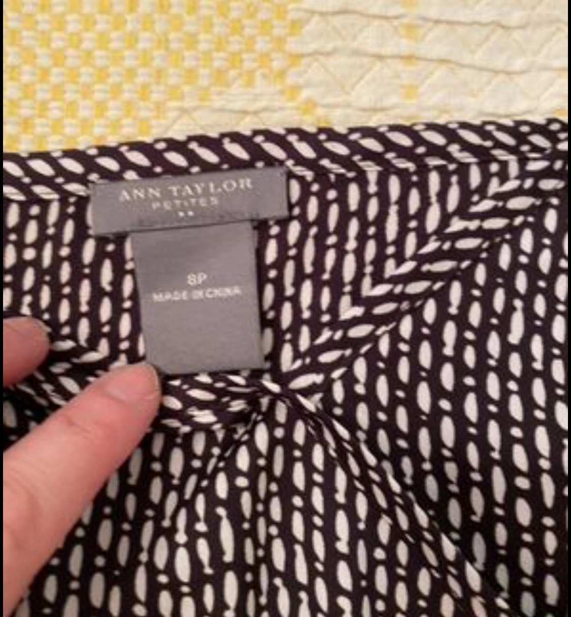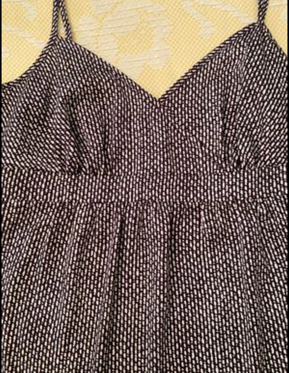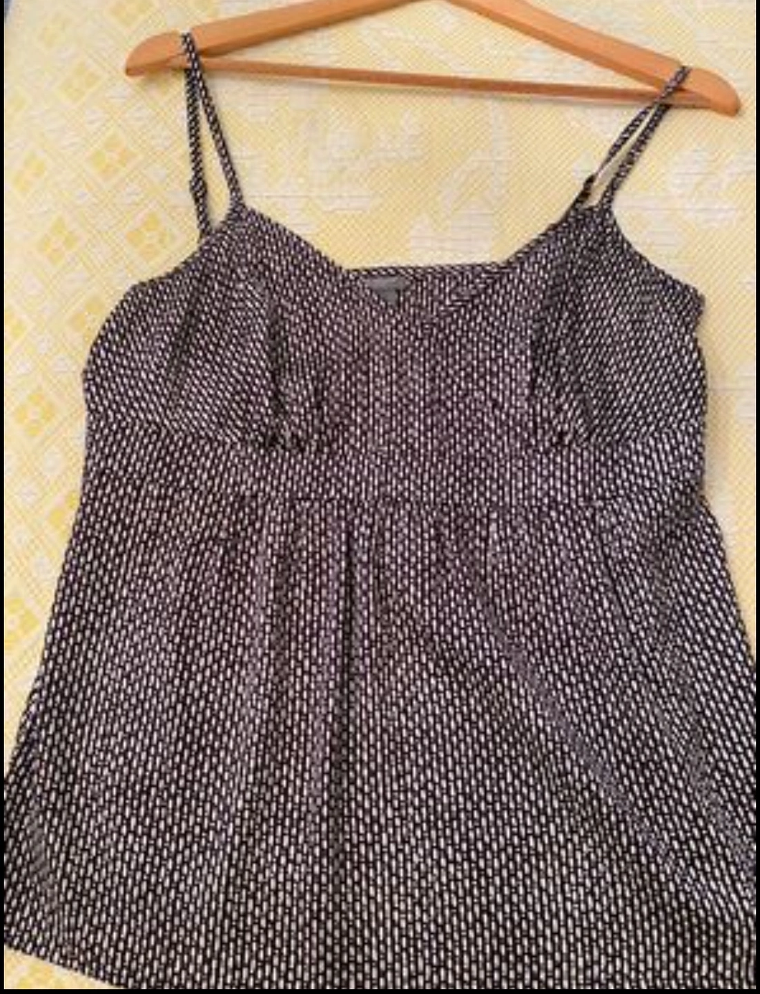 - black and white silk like Ann Taylor tank top with a band underneath the bust area; side zipper and adjustable spaghetti straps