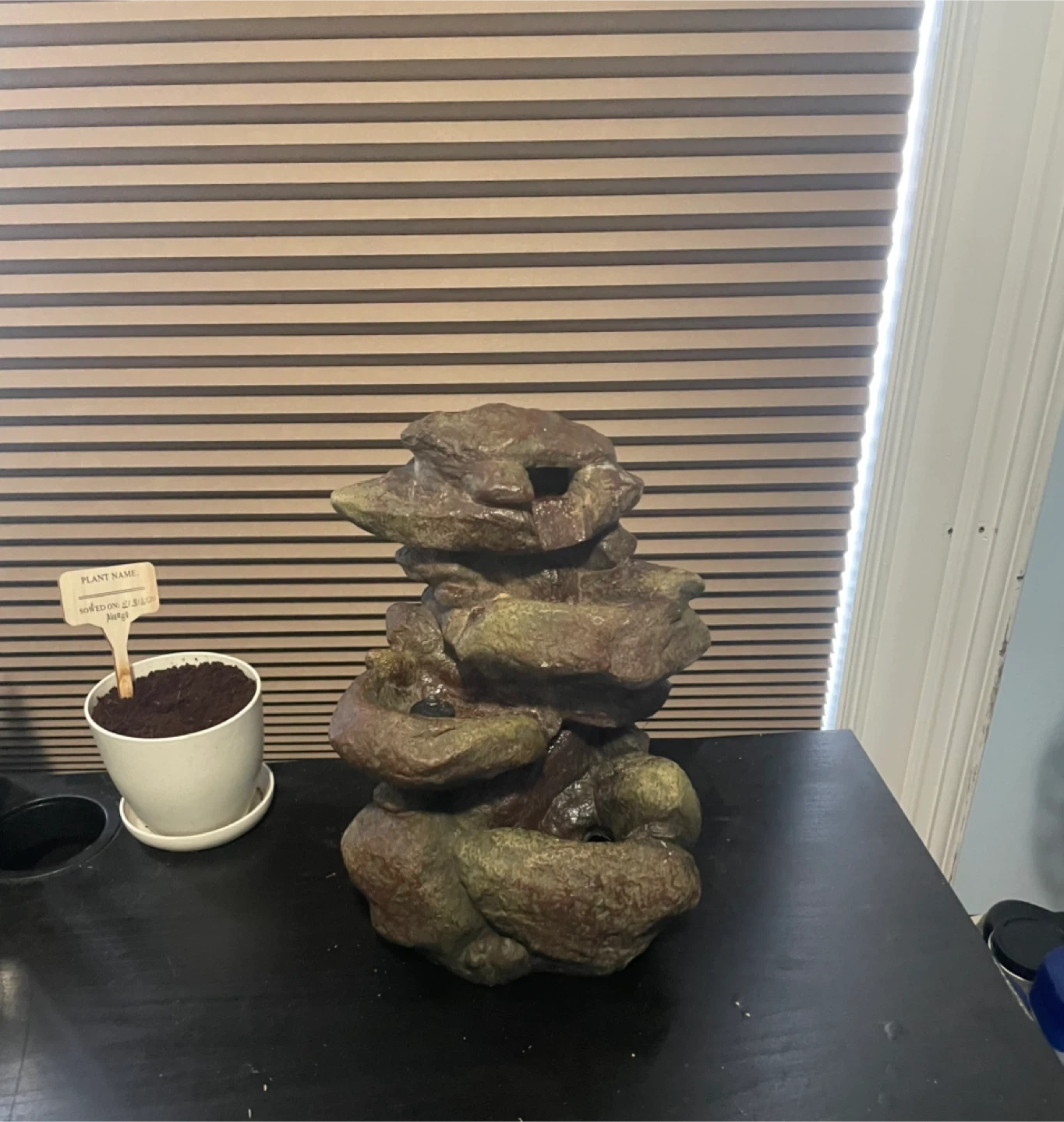 This is a decorative rock water fall that creates a soothing feeling. It's designed to mimic natural rock formations with water cascading down. It's suitable for indoor or outdoor spaces.
