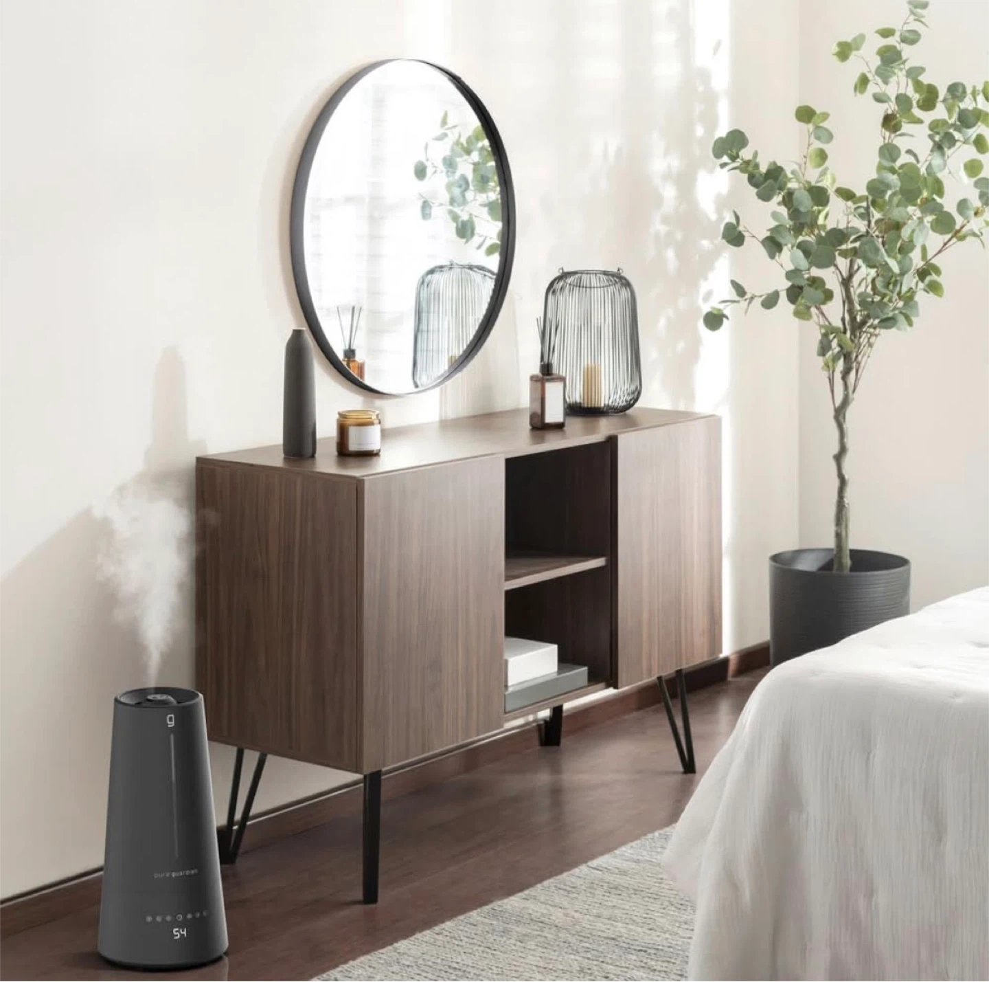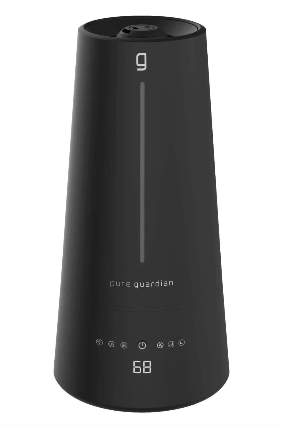 This Pure Guardian ultrasonic humidifier is designed to add moisture to your air. It features a sleek black design with a digital display showing the humidity level. It's easy to operate and maintain, making it a practical addition to any room.