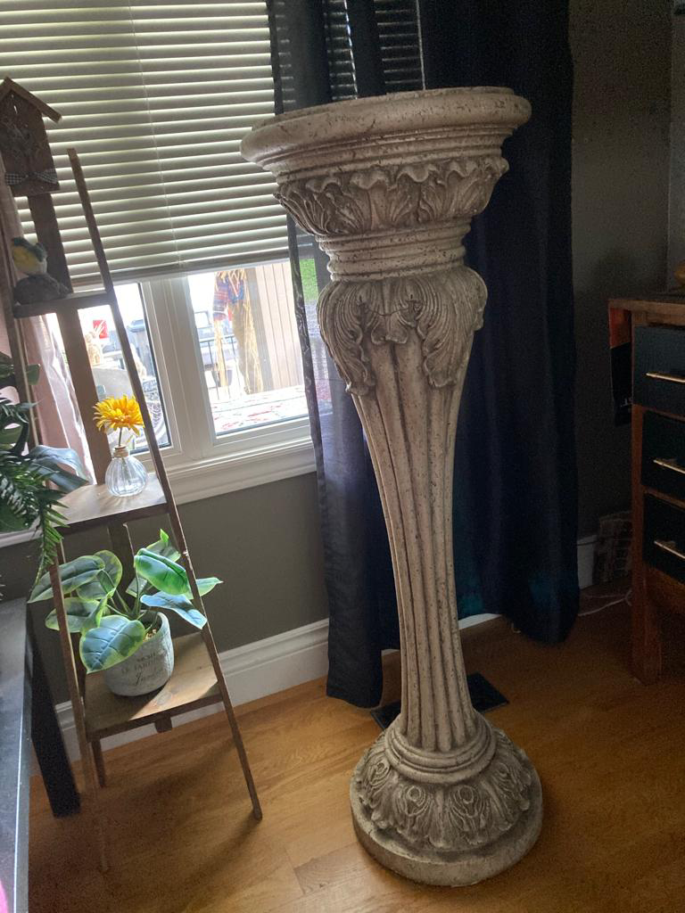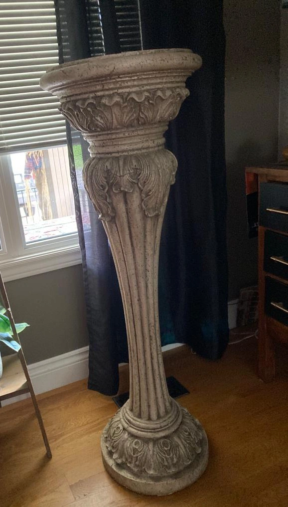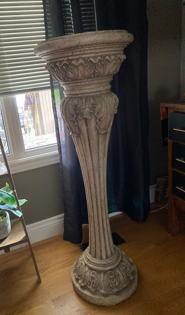 This is a heavy stand that will bring to life any home entrance / office decor..stone/ clay like material ! No pet....on Kids ...non scented home!