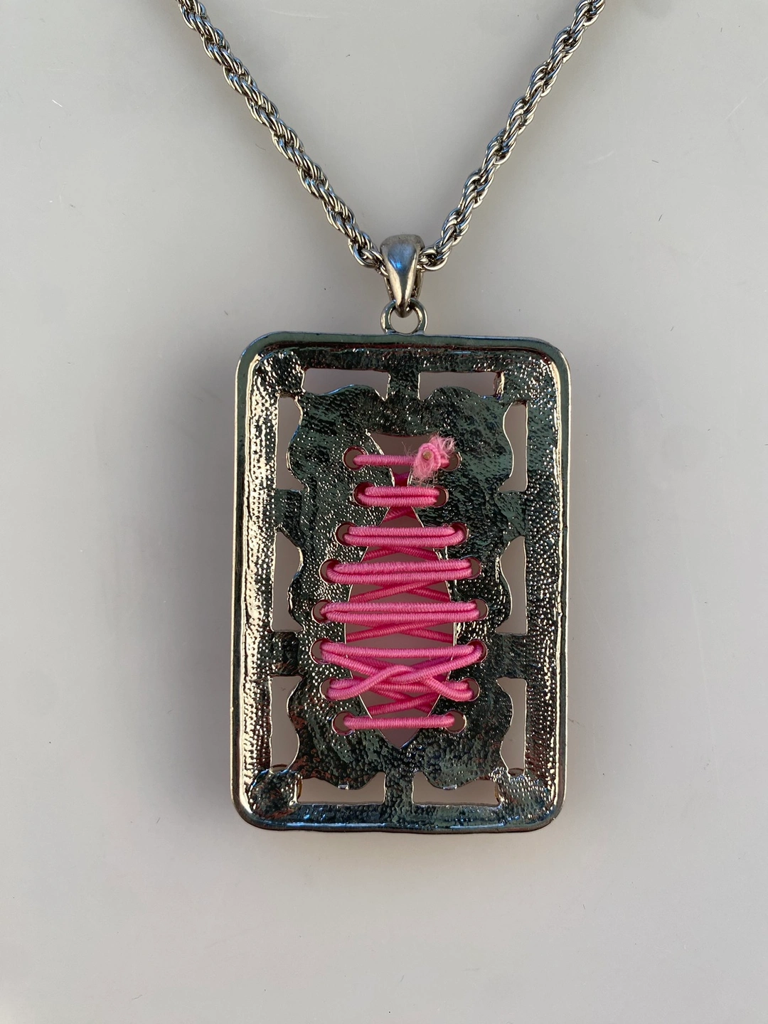 Get funky in this 15.5” long silver coloured metal necklace with a pink corset style pendant by New Fashion. The 13” rope style chain has a 2.5” long rectangular metal pendant that features corset style pink laces in the center and pink rhinestones on the four corners.