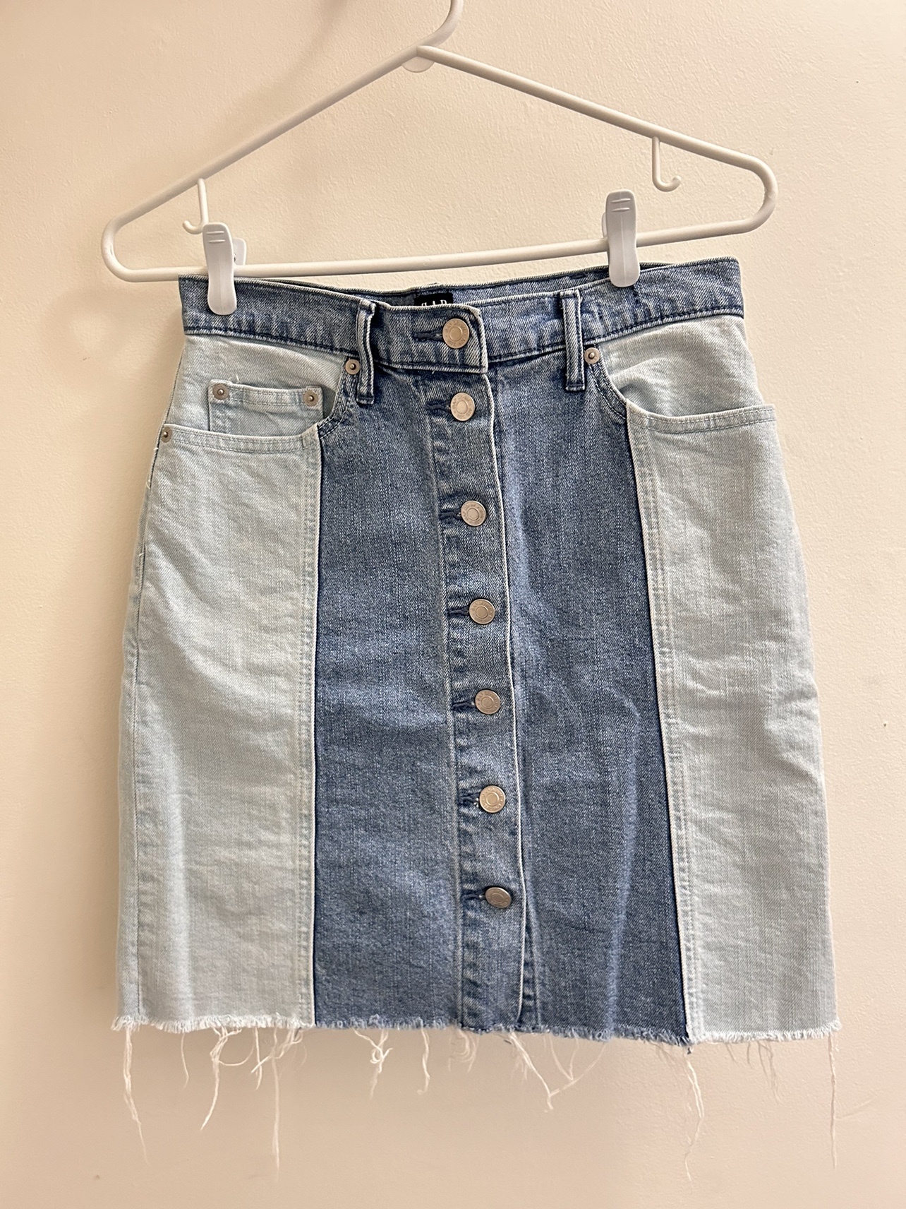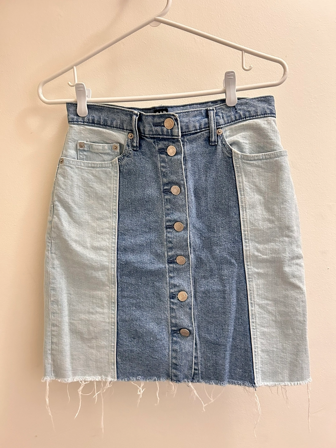 Cute denim skirt with patchwork and front/back pockets. I’m 170cm and the skirt length is just above my knees. I’ve had it for 4 years, but still in very good shape.