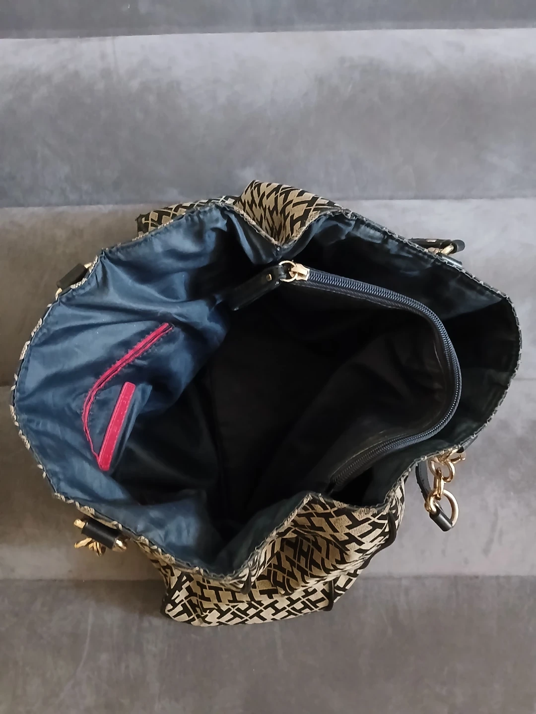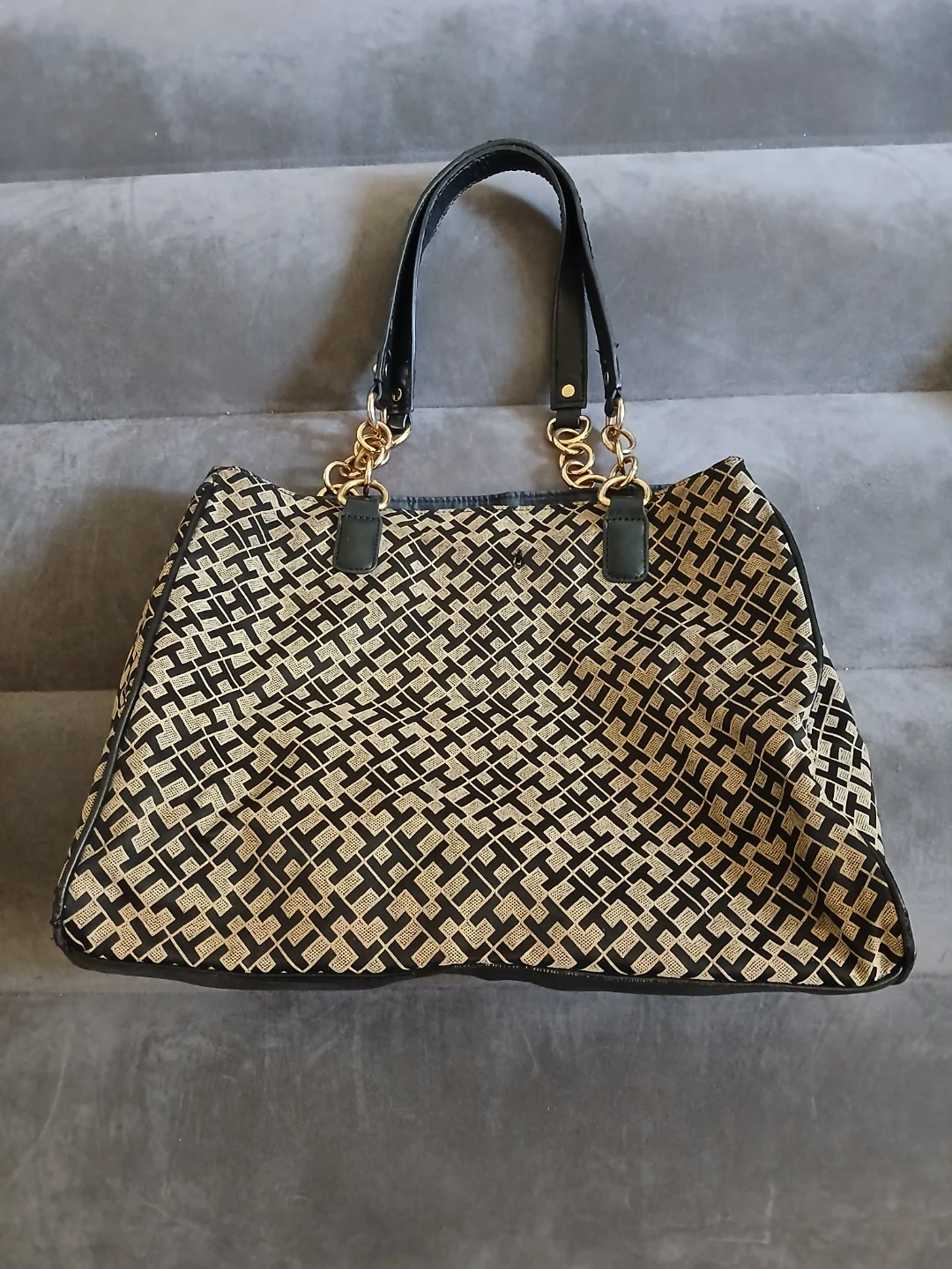 Lightly used Tommy Hilfiger tote bag with signature 'TH' monogram pattern. Features black leather accents and gold chain detailing. Interior has 2 zippered compartments, 1 small open pocket compartment, and 2 open main compartments. Cash only. Pick up or meet up in public place. Willing to bargain on the price.