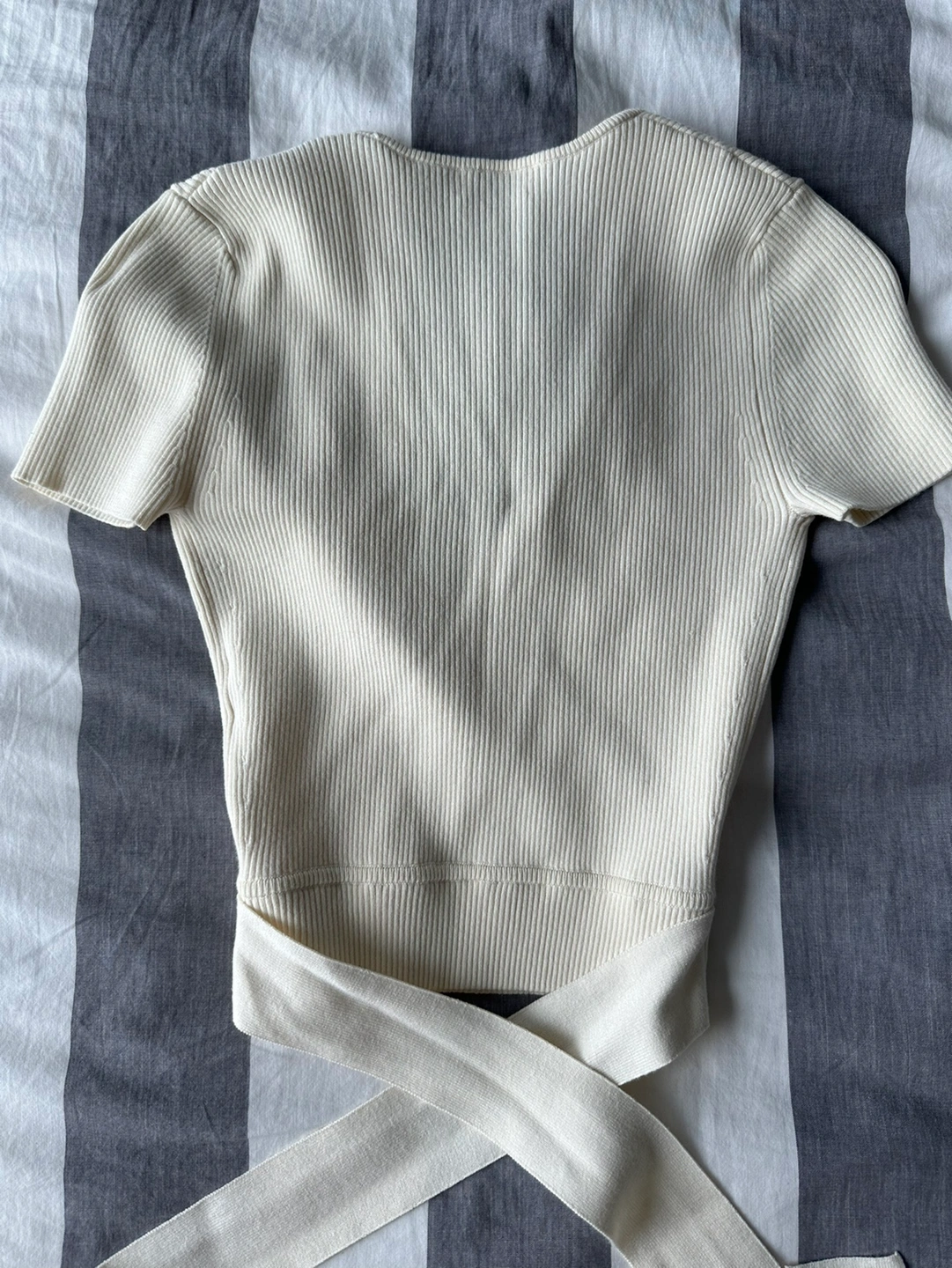 Very comfortable wrap top. It’s cropped so sits at the waist. Small size and very stretchy