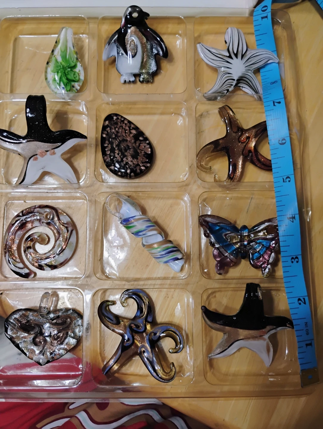A collection of 12 assorted decorative glass figurines. This set includes various shapes like penguins, starfish, butterflies, and abstract designs. They're made of colourful glass and are suitable for display or crafting.