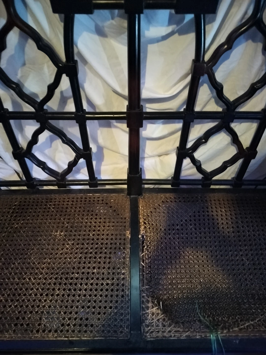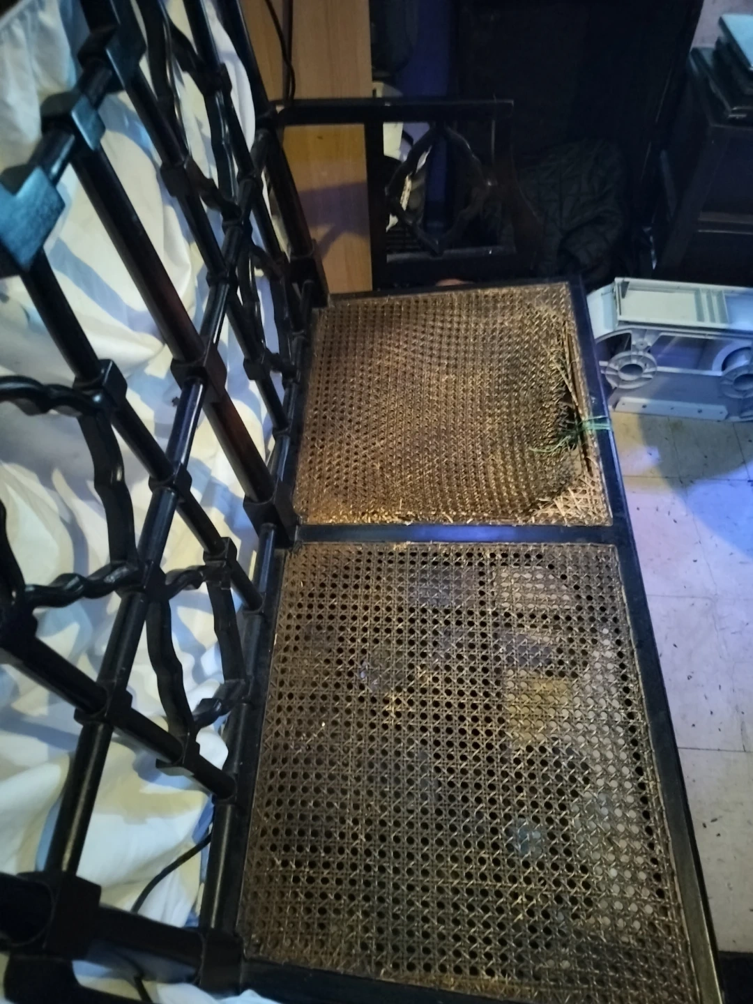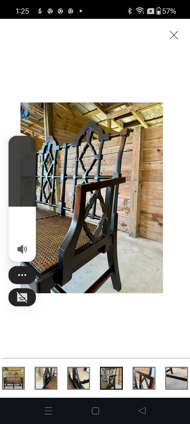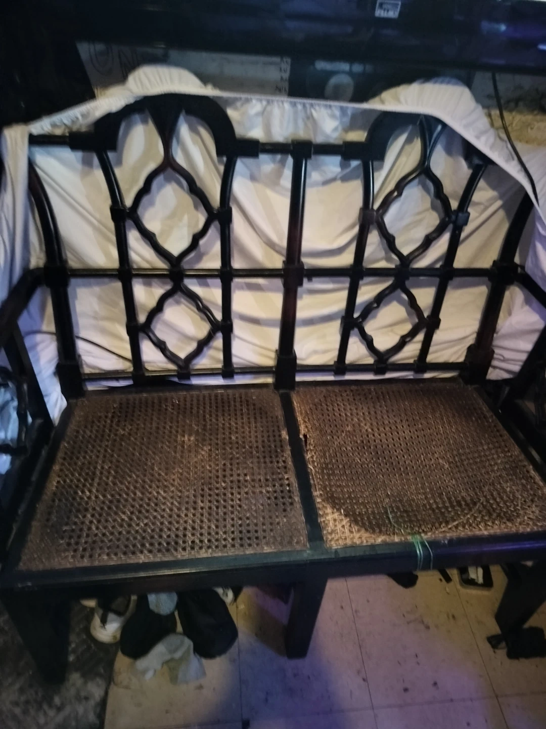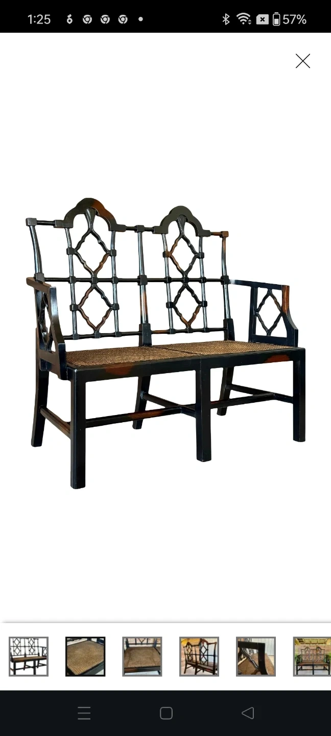 This solid wood bench has a woven seat. It's a two-seater design with decorative detailing on the frame. The seat material is woven cane. One of the seats woven came material has been removed needs replacing....
