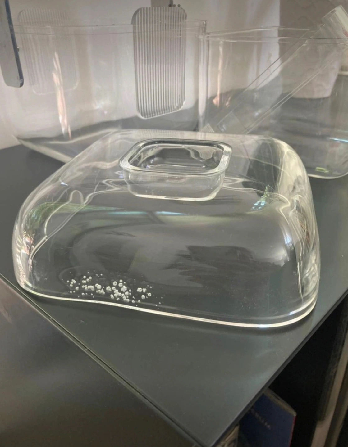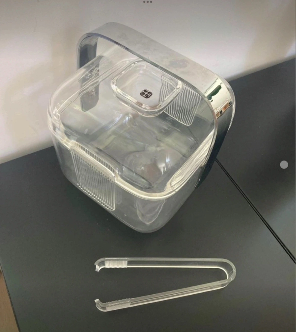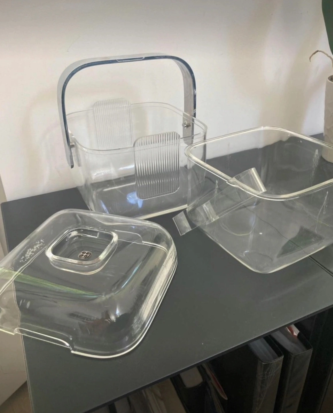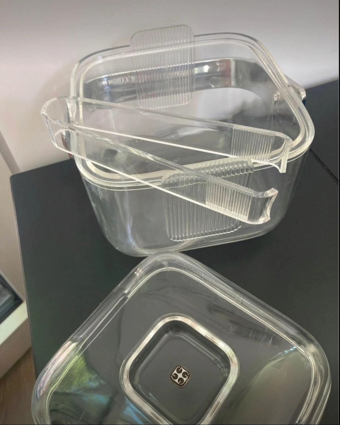 Itโs in great condition, and is complete with its interior bucket to keep things practical and clean, and its tongs. Made in Italy, from the 70s. By Italian designer Guzzini (beautiful simple logo on the lid). Bubbles in one spot from the manufacturing on the lid (itโs not damage).