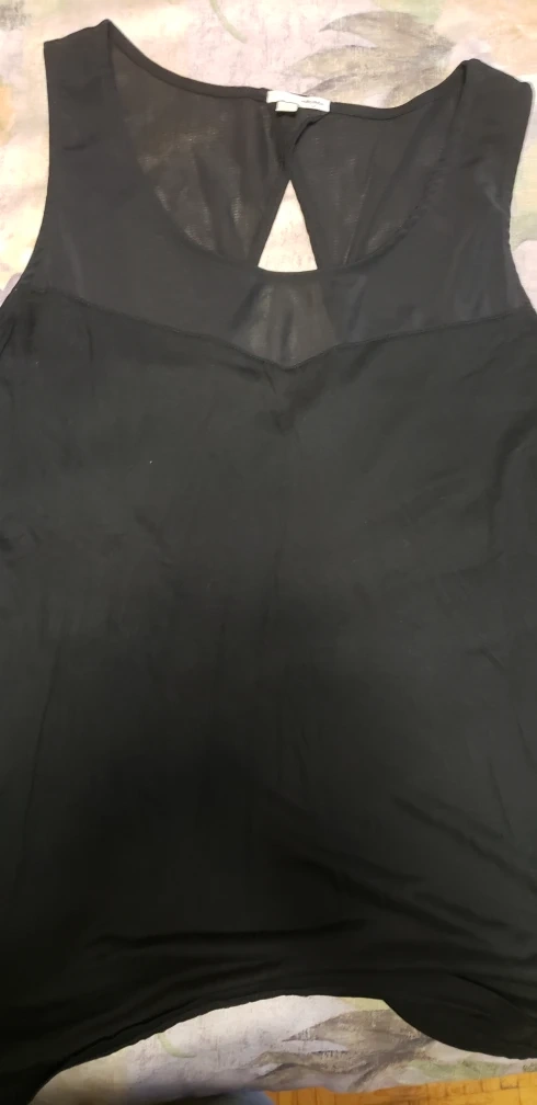 New. Bought in US, tags removed unfortunately. I removed tags, because bought this for a gift. But, its absolutely new. Bought in Bloomingdale's, original price was $65 UD plus tax. Gorgeous, can be dressed up or down, wash cold, stretchy, super cute on the back. Top is a mesh fabric, and bottom is just a black rayon.