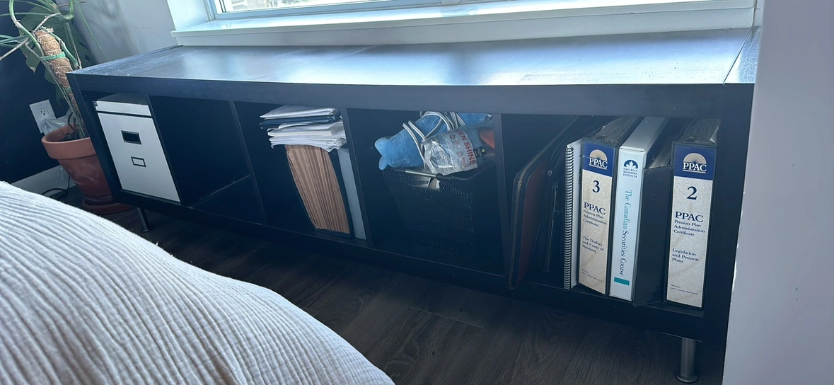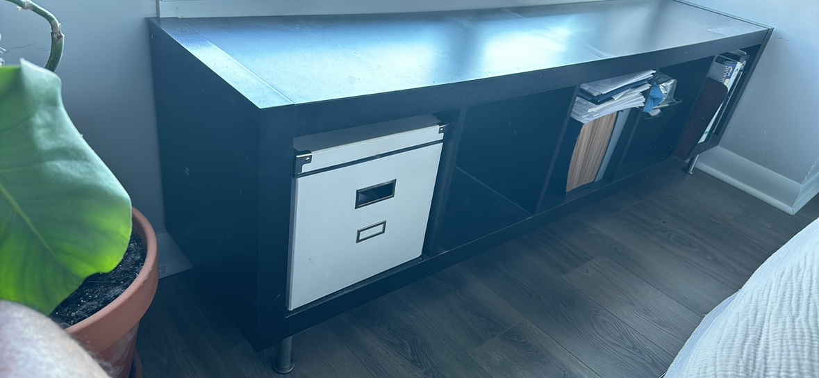 Barely used 5-compartment storage unit. Walnut colour. Unmarked.