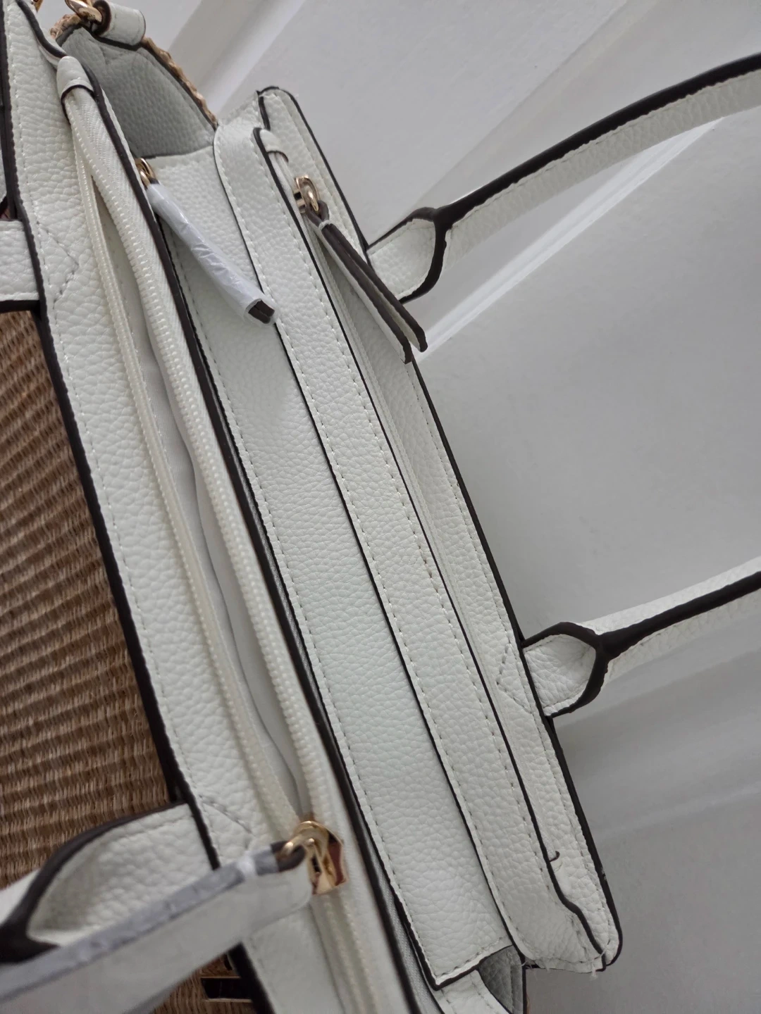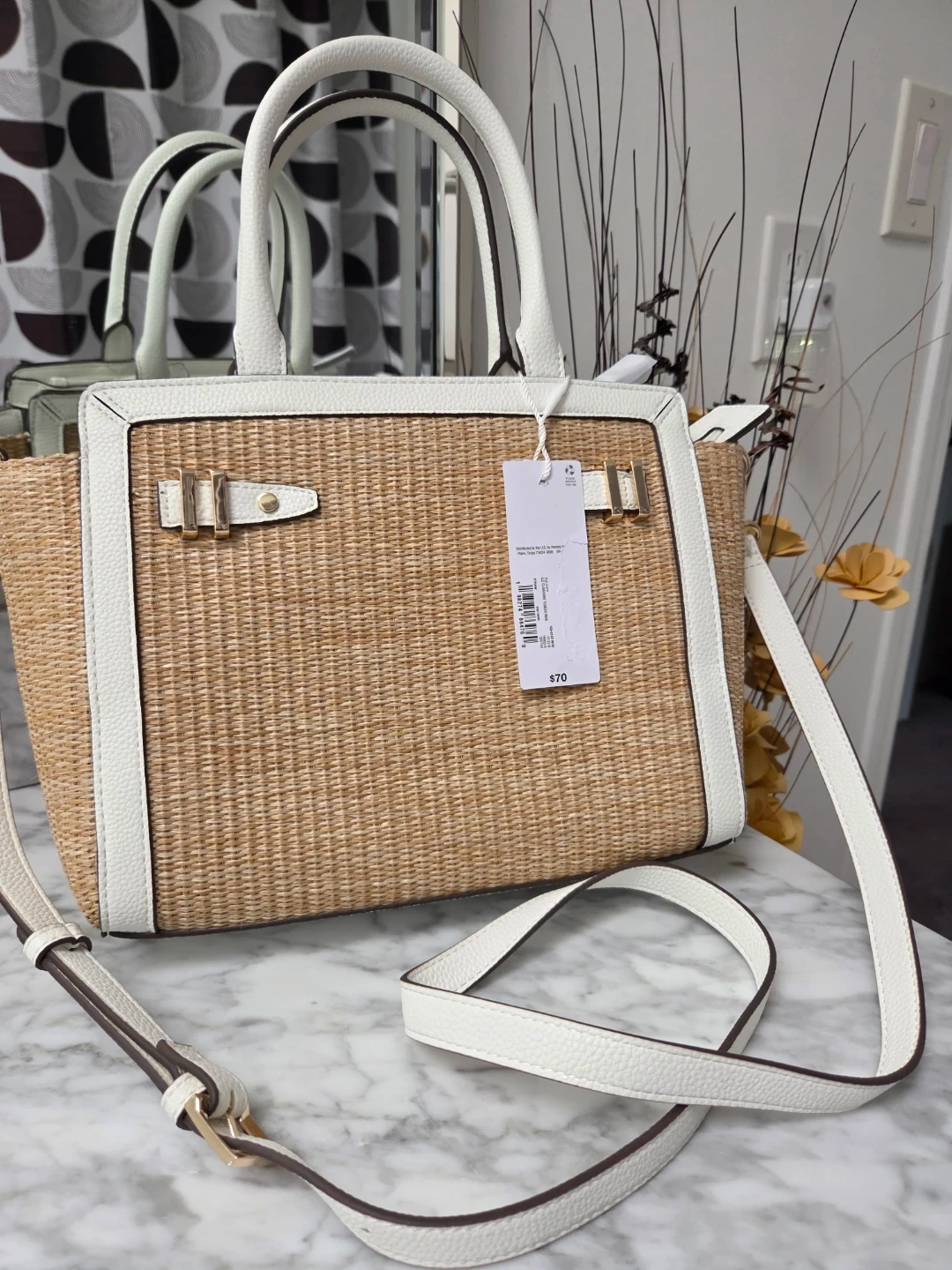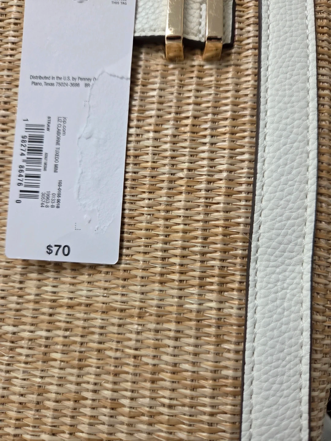 This Liz Claiborne tote bag features a woven straw body with white faux leather trim. It has a removable strap and can be worn as a crossbody or handheld bag. The interior has zippered pockets for organization. It's a stylish accessory for everyday use!