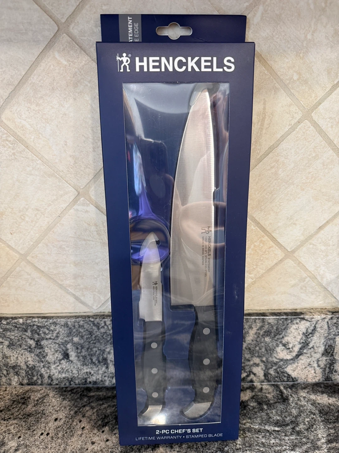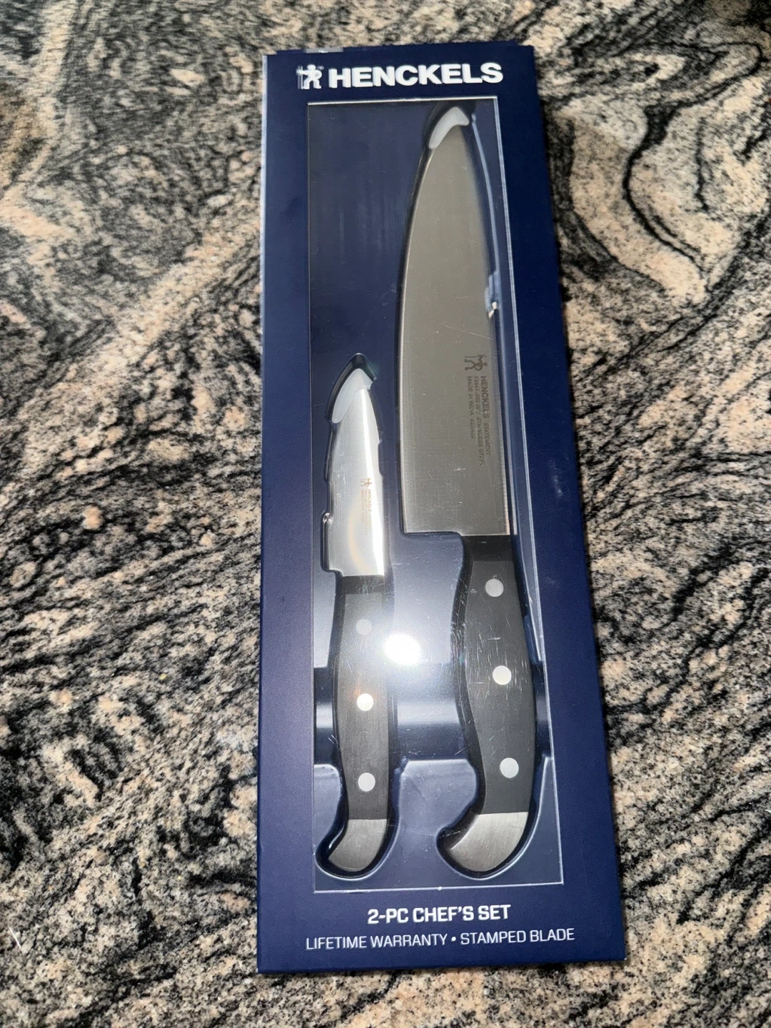 This is a 2-piece Henckels chef's set. It includes a 8" chef's knife and a 3" paring knife. The knives feature high-quality stainless steel blades with triple-rivet handles. Lifetime warranty, dishwasher safe!