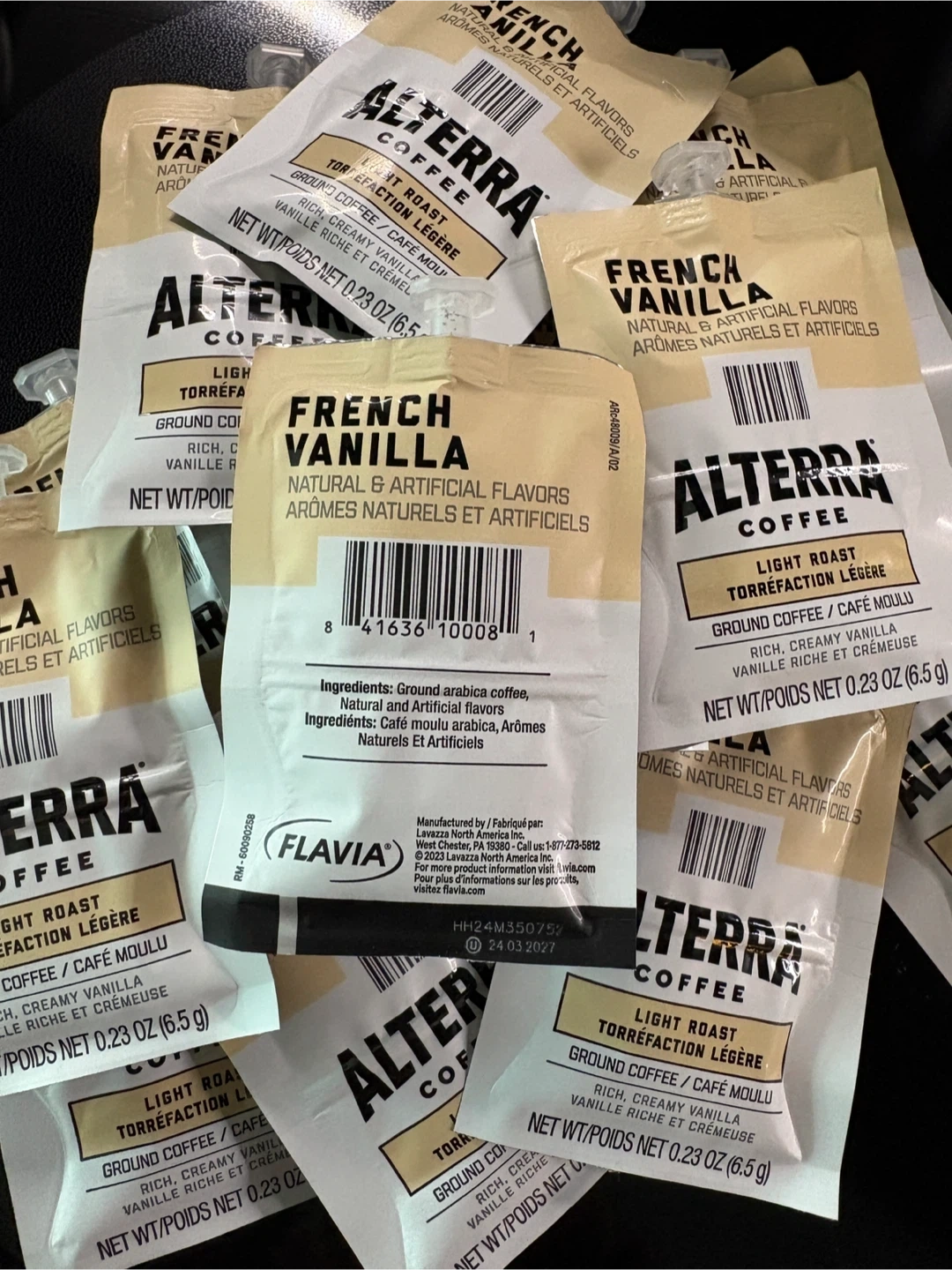FLAVIA Alterra Coffee - French Vanilla Fresh Packs ground coffee comes in single-serve pouches. Each pouch contains 0.23 oz (6.5 g) of coffee. This is a great option for a quick, individual cup of coffee!