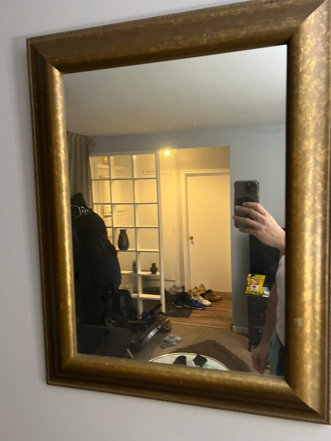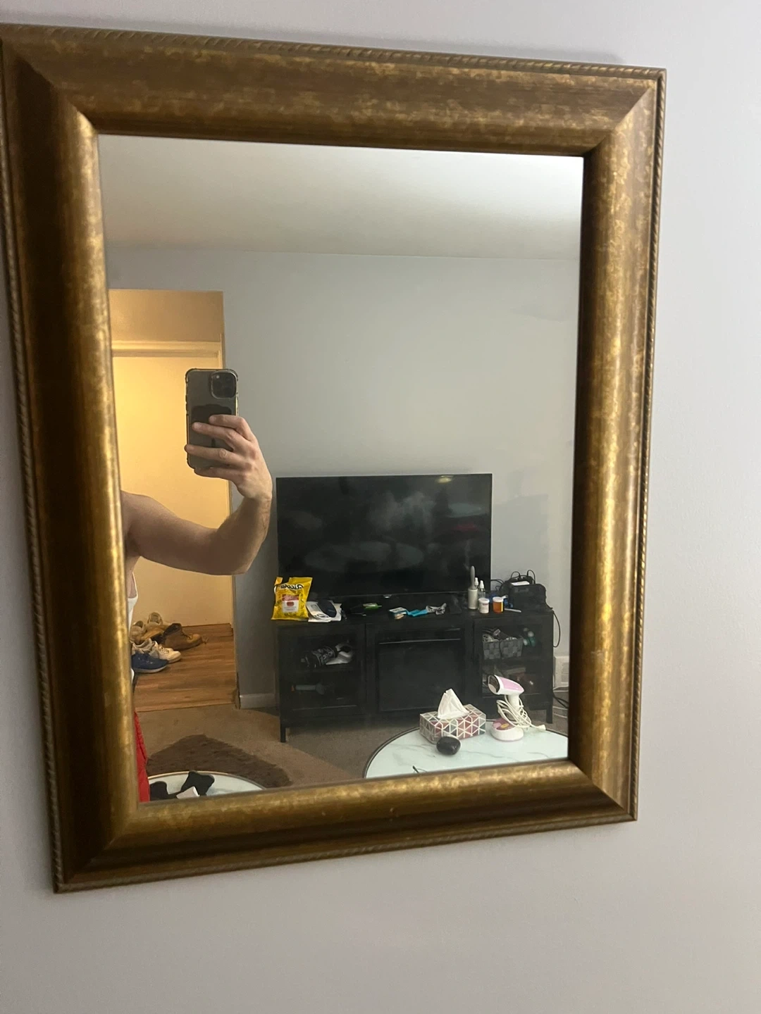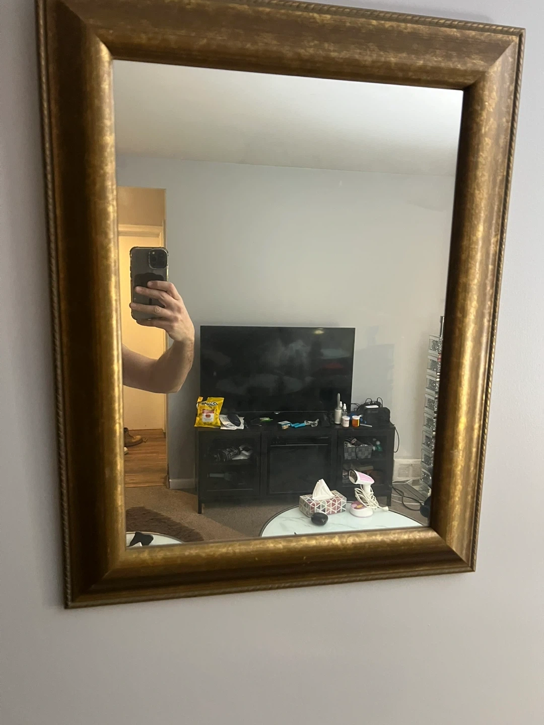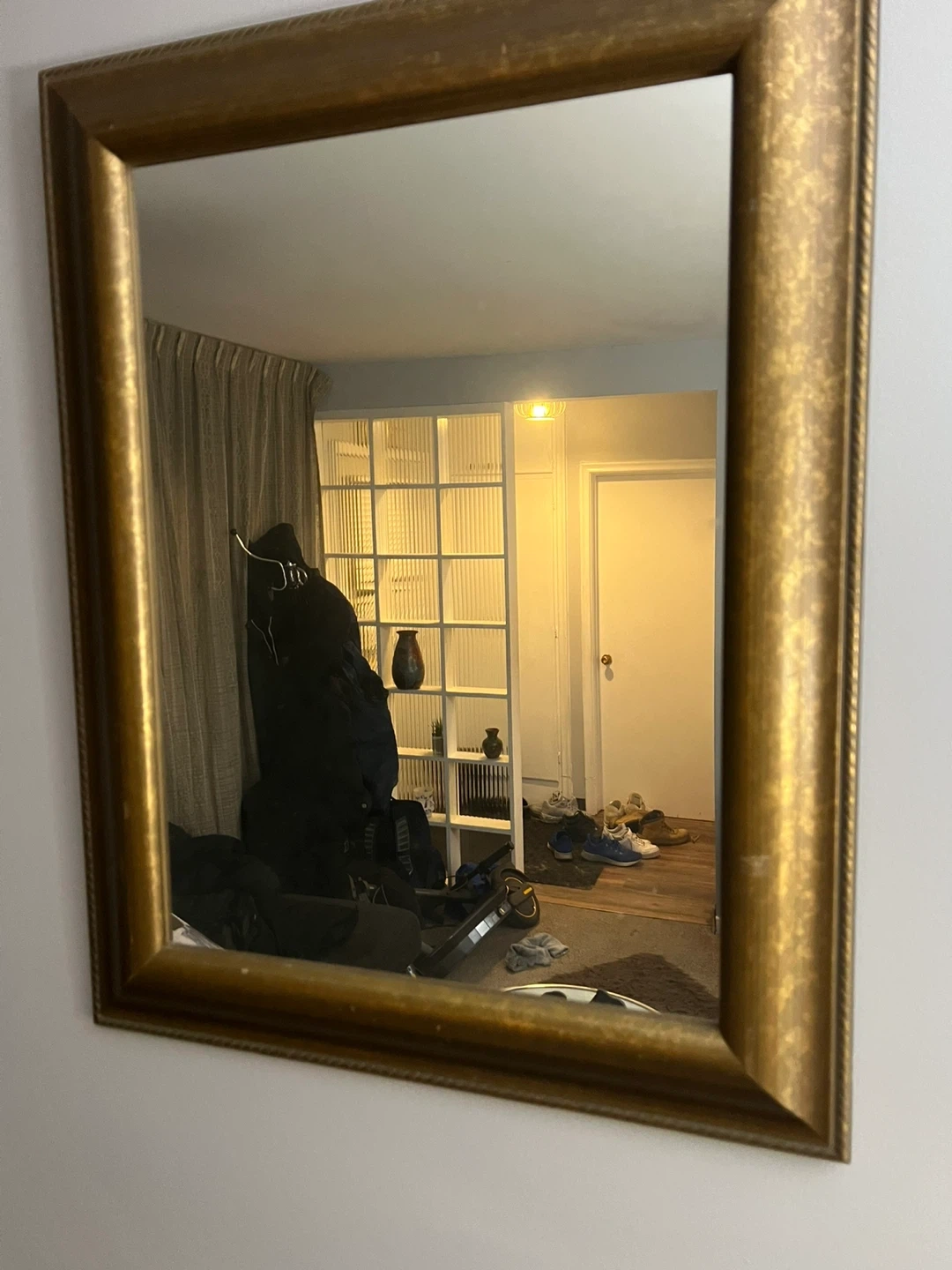 Gold-toned decorative wall mirror. Its ornate frame adds a touch of elegance to any room. Mirror's dimensions are approximately 20 inches by 26 inches.