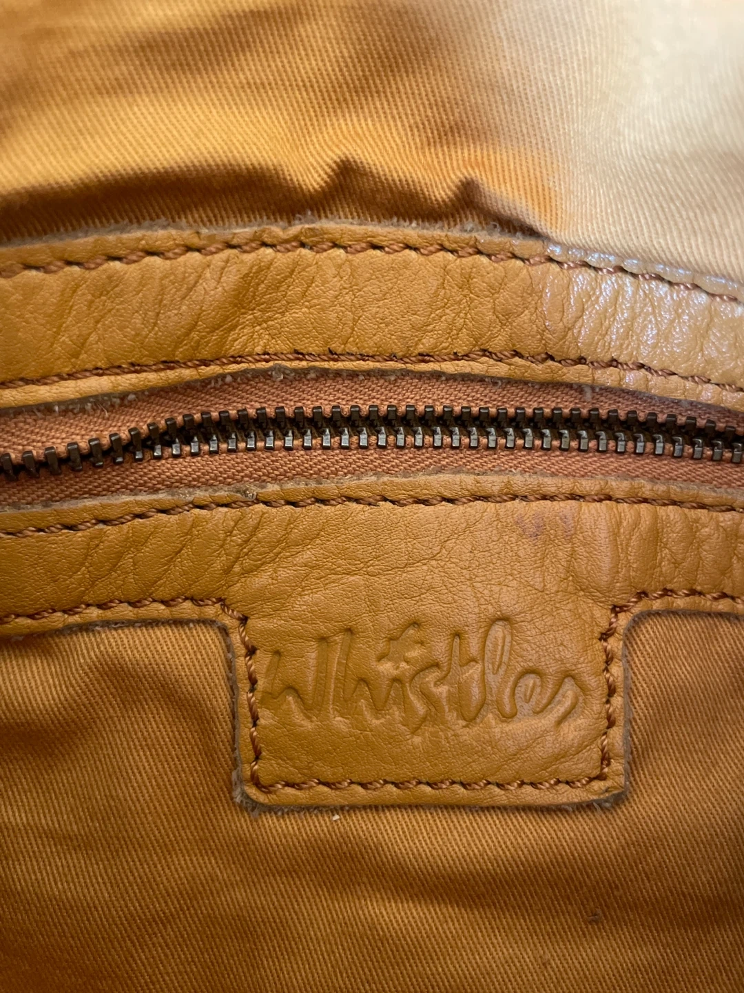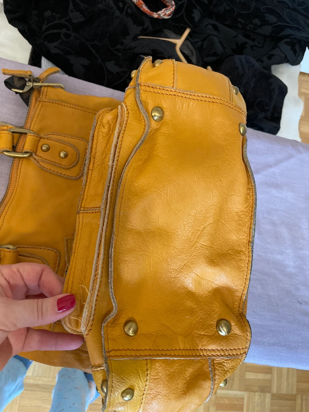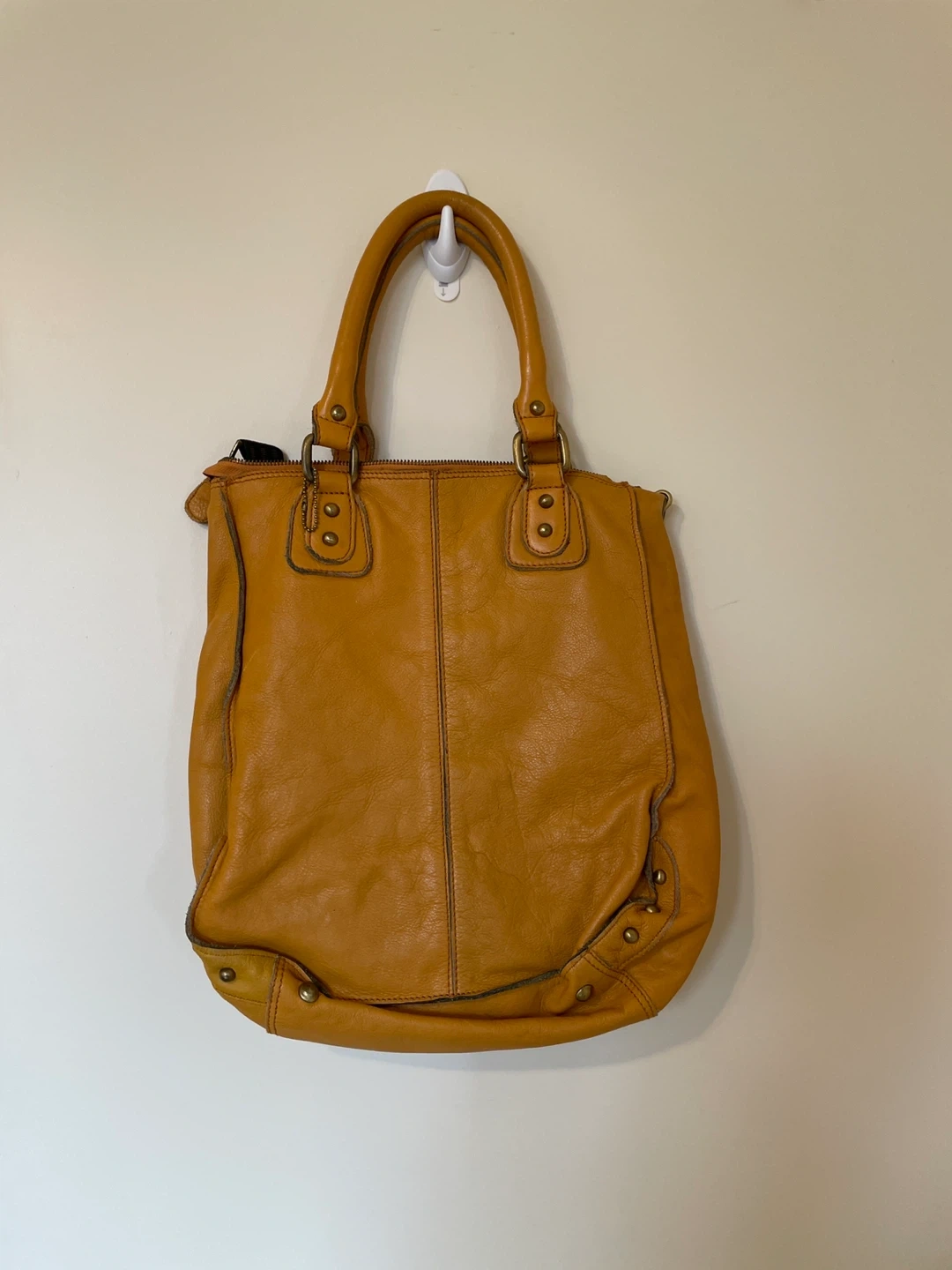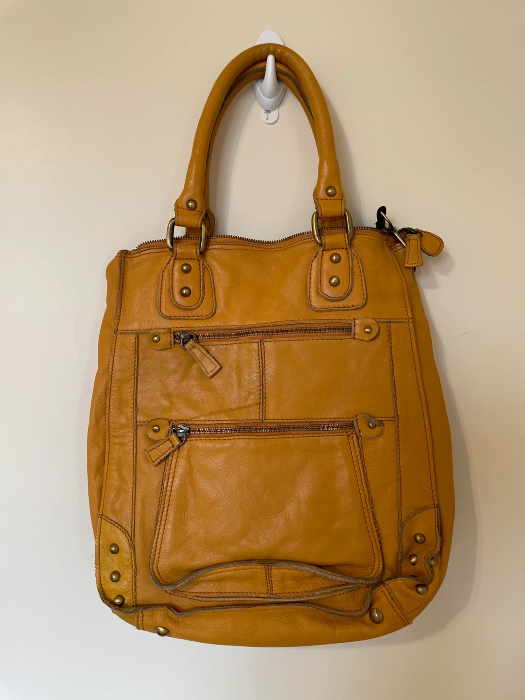 A stylish mustard yellow leather shoulder bag by Whistles. It's a versatile size with multiple zippered pockets. Genuine leather construction, excellent quality, could fit laptop or office .