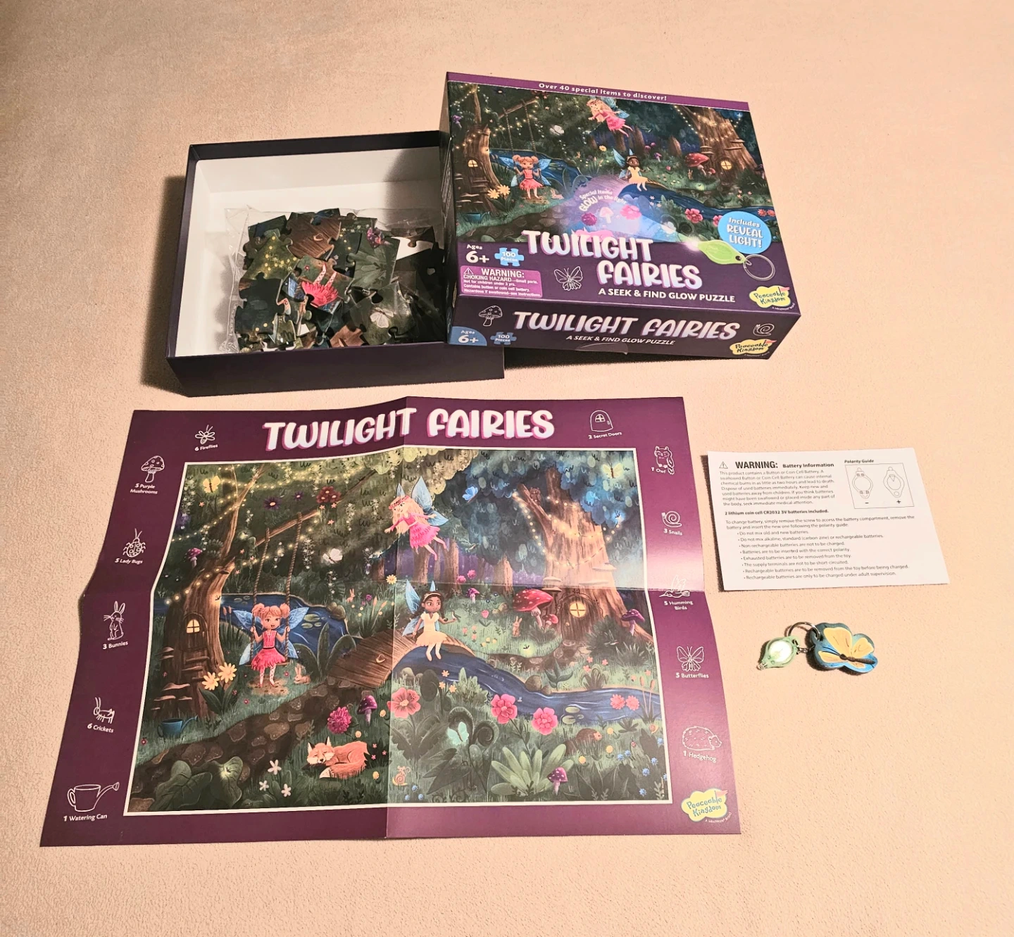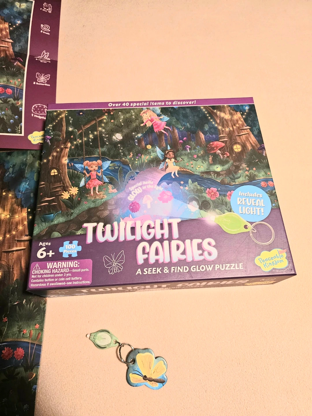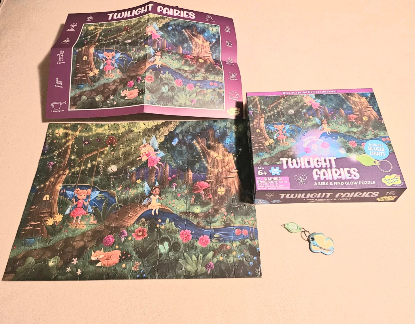 Educational Fun 100-piece "Twilight Fairies" seek & find glow puzzle by Peaceable Kingdom. It includes a poster and a cool special reveal light to help find glowing items. Suitable for ages 6 and up. Completed puzzle measures 20" by 15" $10