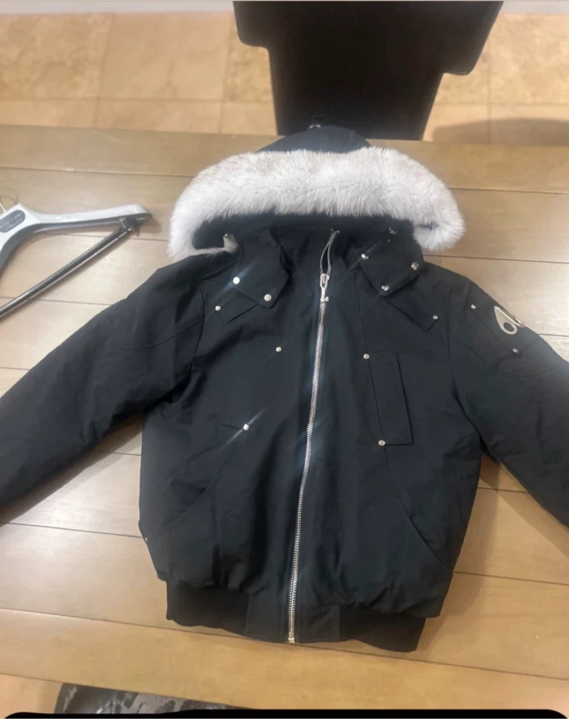 Moose Knuckles Black Bomber Jacket with Fur Hood