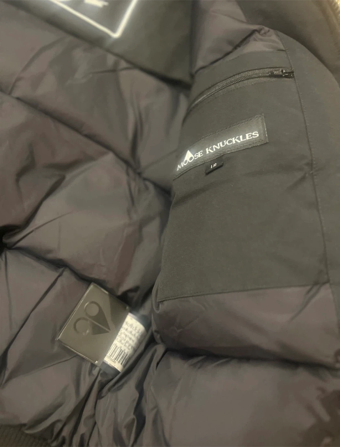 This is a Moose Knuckles black bomber jacket. It's down-filled and features a fur-lined hood. It's made in Canada with Canadian and imported components.