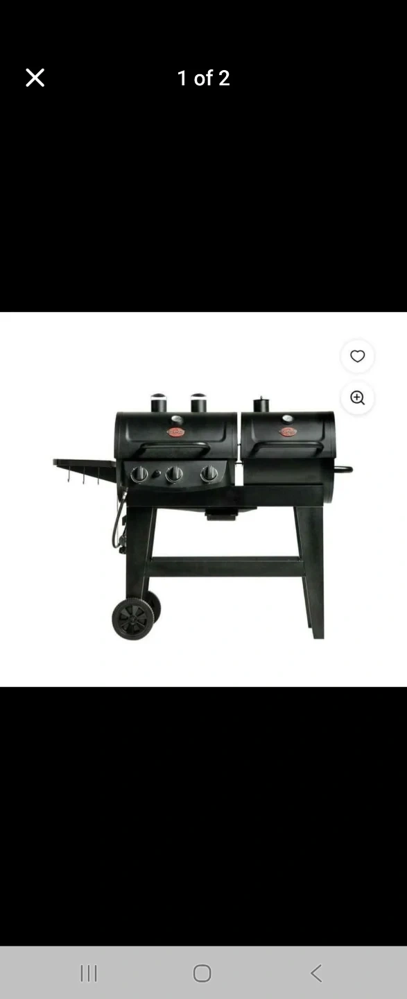 This Char-Griller Duo grill combines gas and charcoal for versatile cooking. It features three gas burners and a side charcoal smoker box. Built with durable cast iron and steel.