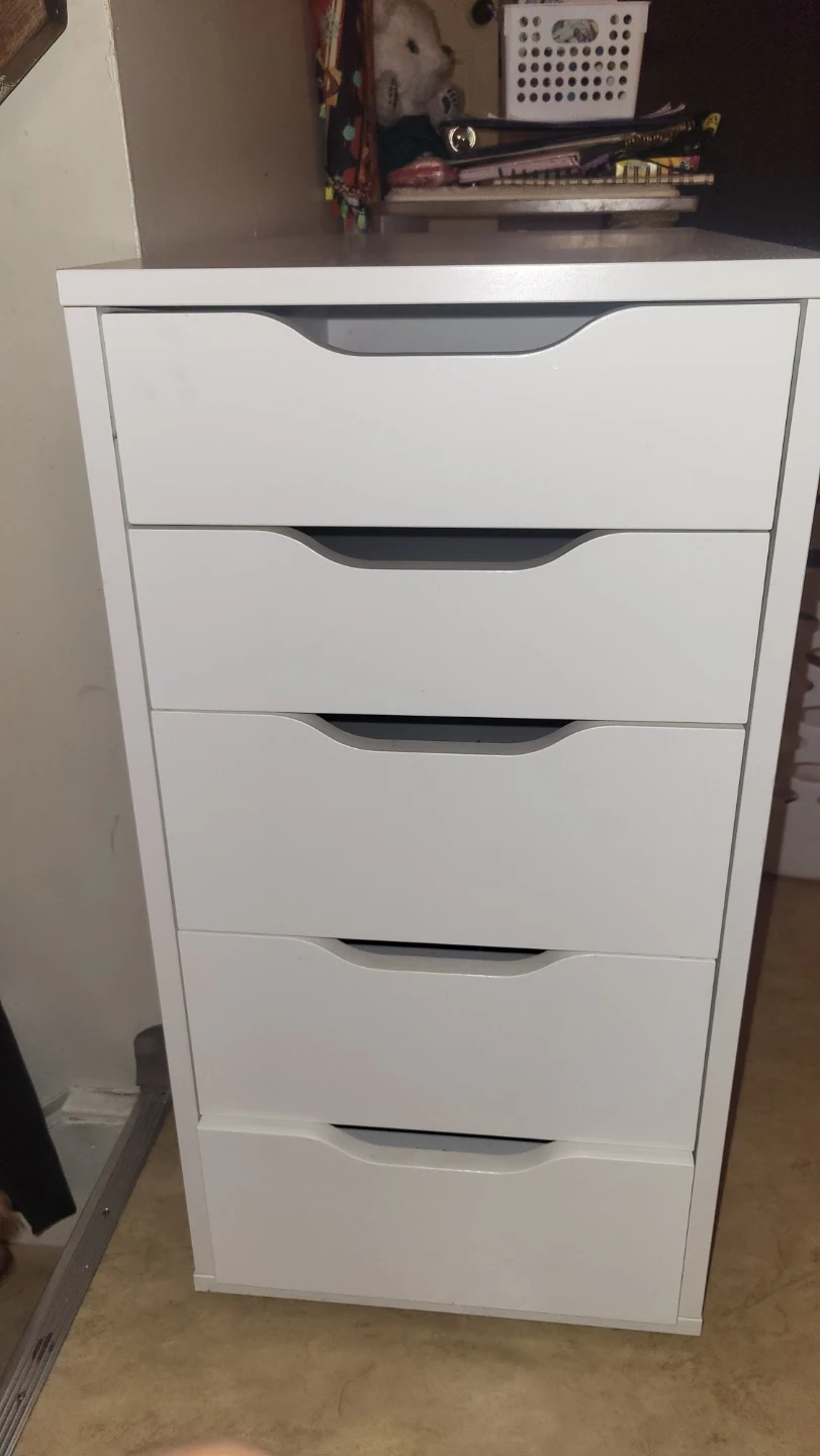 This is a white 5-drawer Alex unit. It's made of particleboard and fibreboard. It's great for organizing craft supplies or makeup!