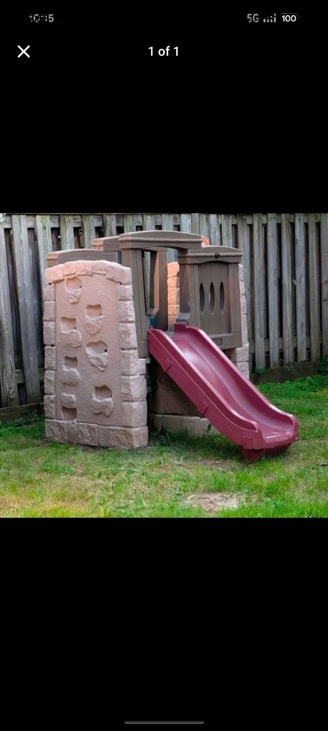 This Step2 playhouse features a climbing wall and a slide. It's made of durable plastic in brown and beige tones with a red slide. It's a fun addition for outdoor play.