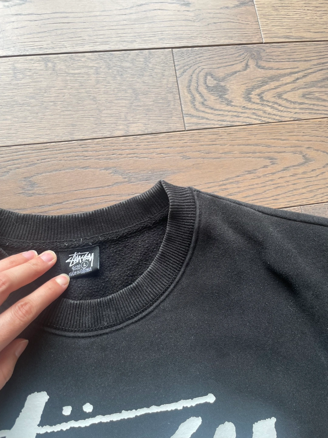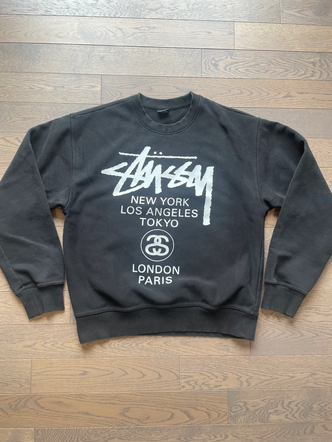 Black Stüssy crewneck sweatshirt with New York, Los Angeles, Tokyo, London, Paris, Brooklyn, Venice, and Santa Ana graphics. Cotton blend material.