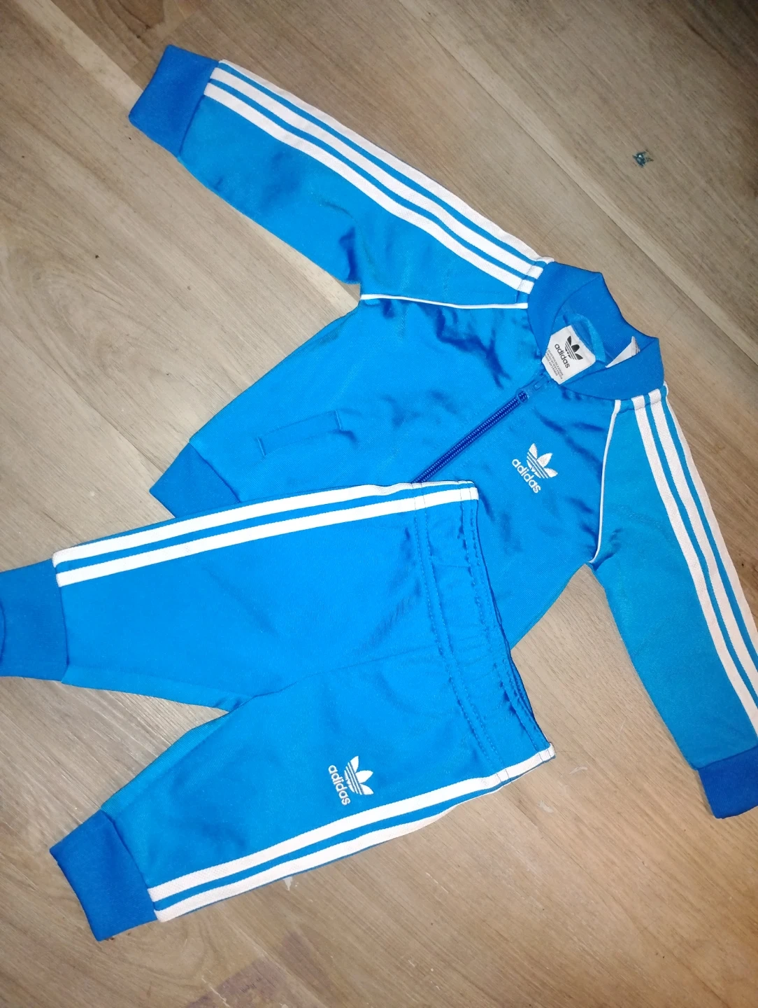 Bright blue Adidas tracksuit for infants. Features the classic three stripes on the sleeves and legs, with Adidas logos on the jacket and pants. Made for comfort and active play! 3/6 months