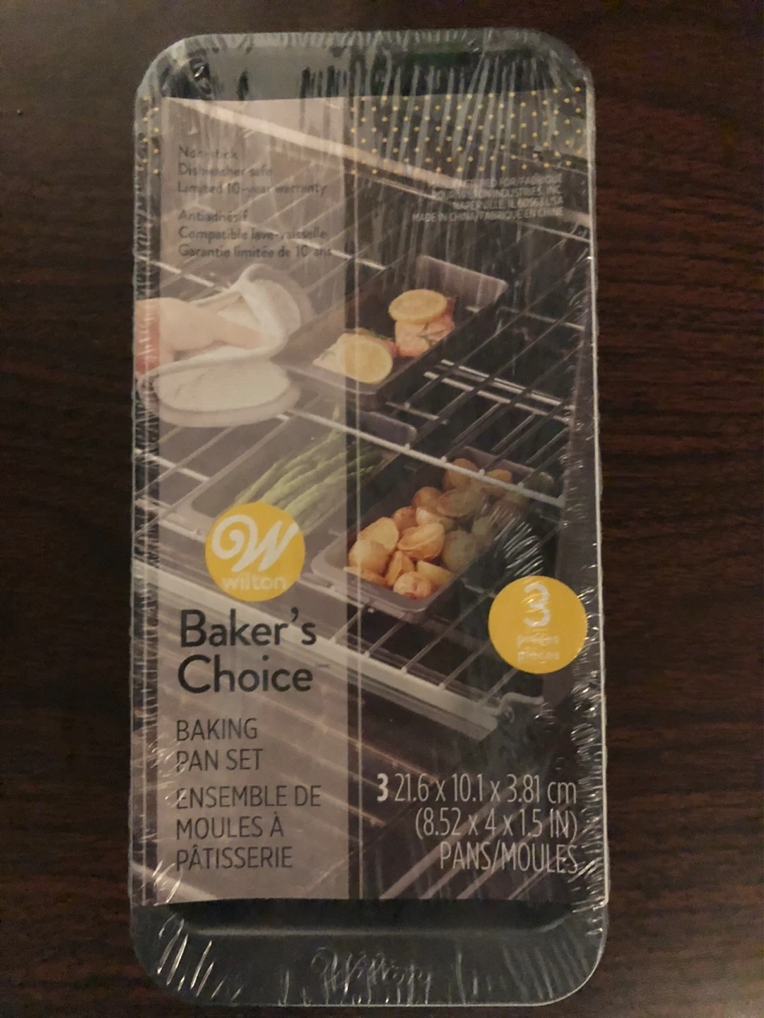 This Wilton Baker's Choice baking pan set includes three pans. Dimensions are 21.6 x 10.1 x 3.81 cm (8.52 x 4 x 1.5 inches). These pans are durable and easy to clean.