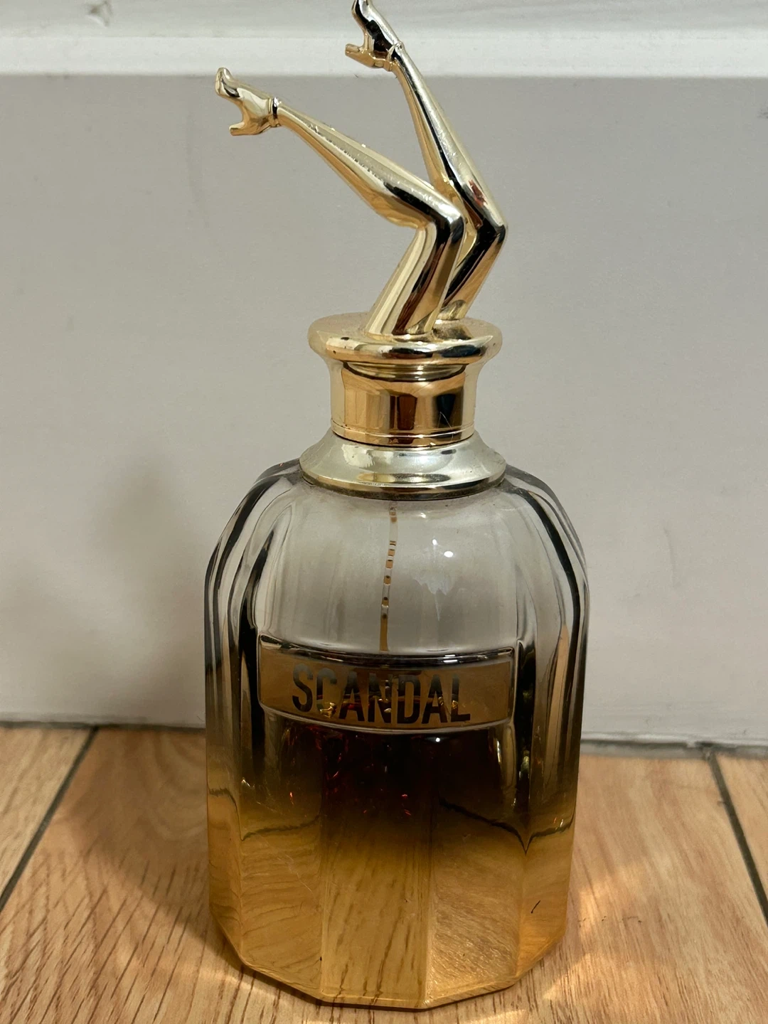 This is a Jean Paul Gaultier Scandal Eau de Parfum. It features a distinctive bottle with a gold-toned cap shaped like legs. The fragrance is housed in a fluted glass bottle with a gold gradient.