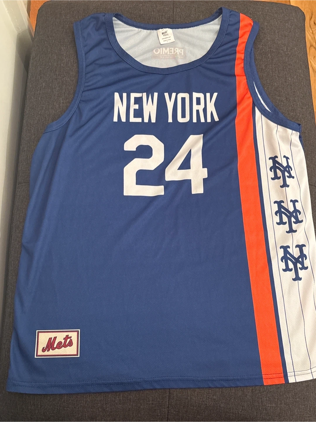This is a New York Mets jersey featuring the number 24. It has "Mets" on the front and "New York" above the number. The back has "Mets" and the number 24. "Premio" is visible on the back collar. It's blue with orange and white accents on the sides.