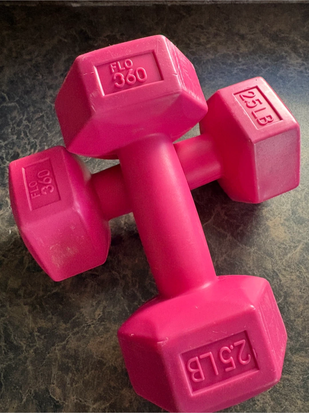 This is a pair of bright pink dumbbells, each weighing 2.5 LB. They have hexagonal ends to prevent rolling. These are great for light workouts or toning exercises!